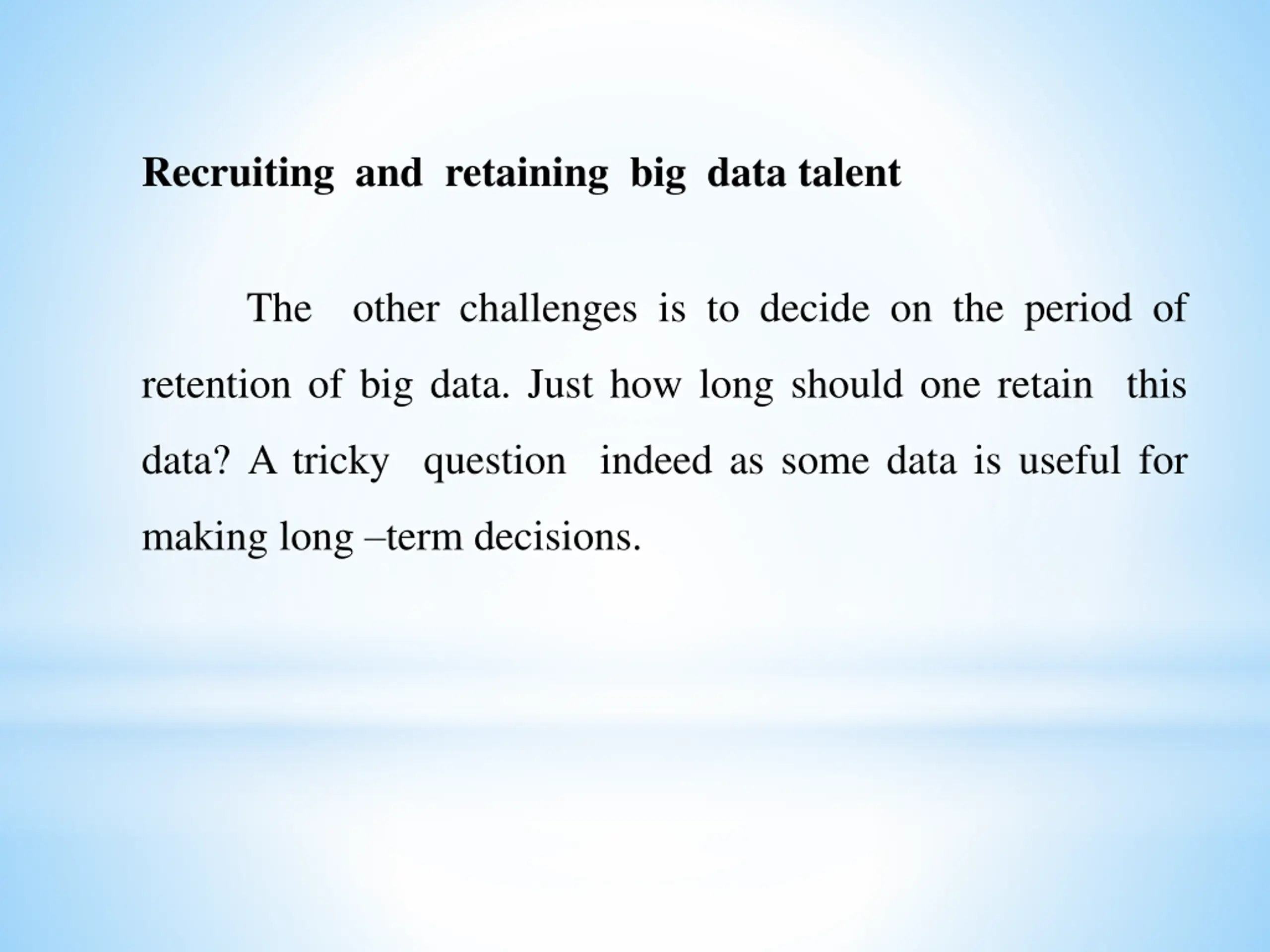 Recruiting and retaining big data talent The other challenges is to decide on the period of retention of big data. Just how long should one retain this data? A tricky question indeed as some data is useful for making long term decisions.