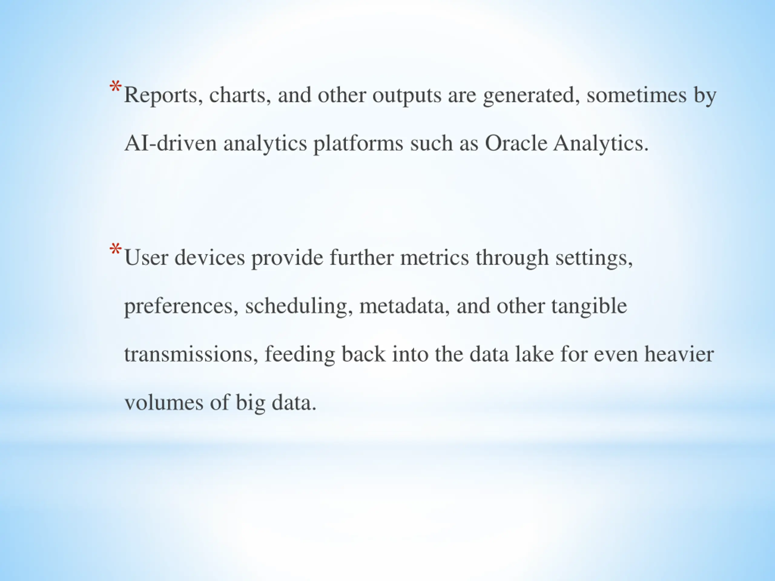 *Reports, charts, and other outputs are generated, sometimes by AI-driven analytics platforms such as Oracle Analytics. *User devices provide further metrics through settings, preferences, scheduling, metadata, and other tangible transmissions, feeding back into the data lake for even heavier volumes of big data.