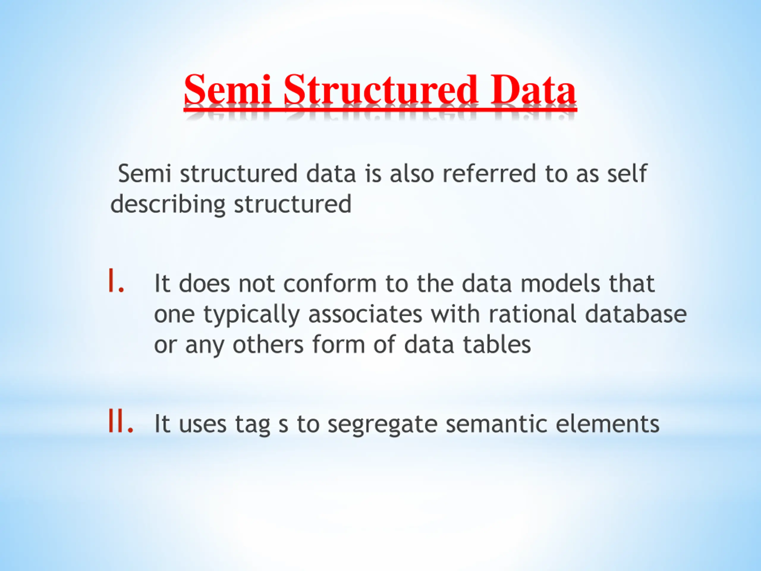 Semi Structured Data Semi structured data is also referred to as self describing structured I. It does not conform to the data models that one typically associates with rational database or any others form of data tables II. It uses tag s to segregate semantic elements