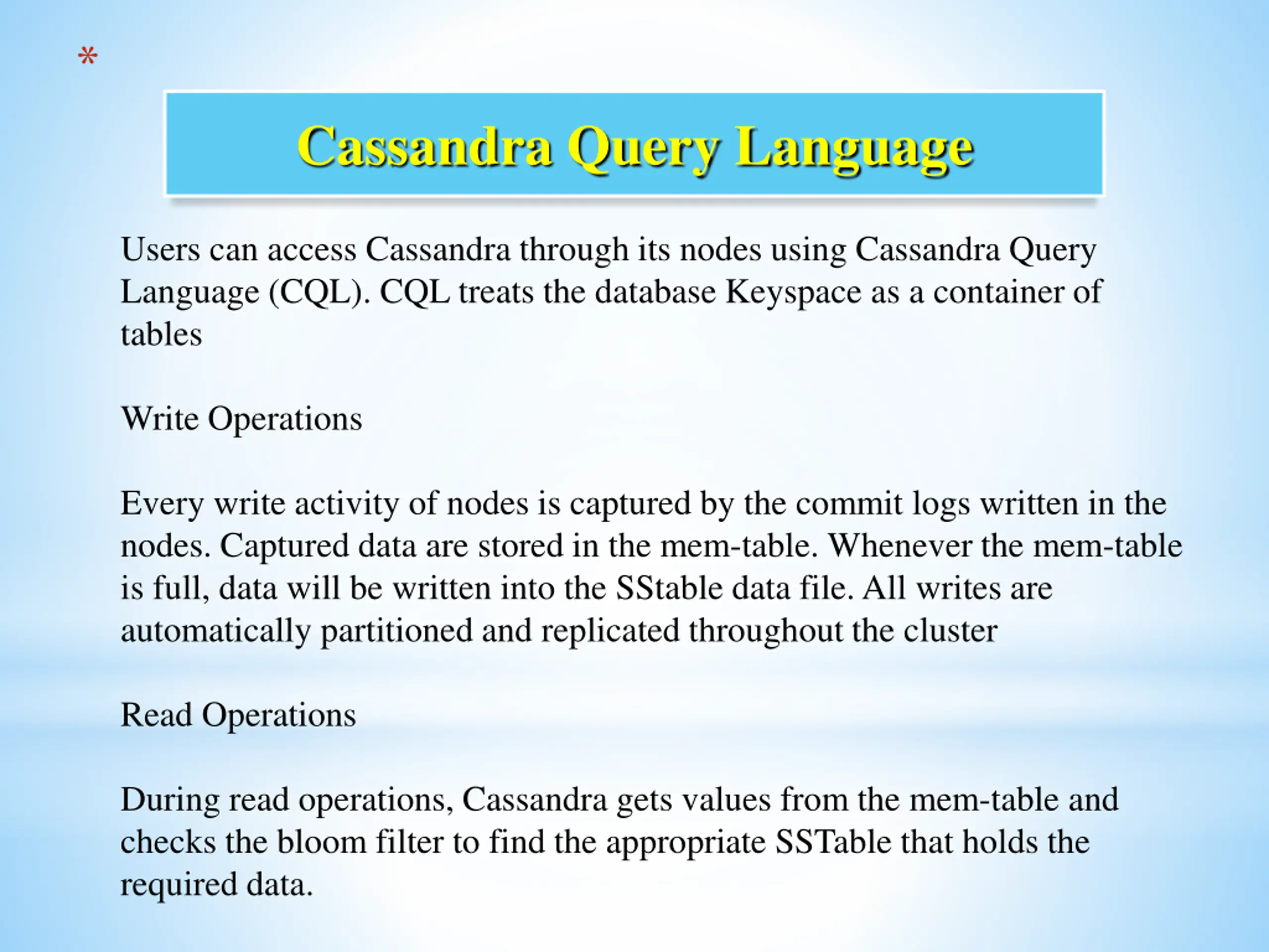 * Cassandra Query Language Users can access Cassandra through its nodes using Cassandra Query Language (CQL). CQL treats the database Keyspace as a container of tables Write Operations Every write activity of nodes is captured by the commit logs written in the nodes. Captured data are stored in the mem-table. Whenever the mem-table is full, data will be written into the SStable data file. All writes are automatically partitioned and replicated throughout the cluster Read Operations During read operations, Cassandra gets values from the mem-table and checks the bloom filter to find the appropriate SSTable that holds the required data.