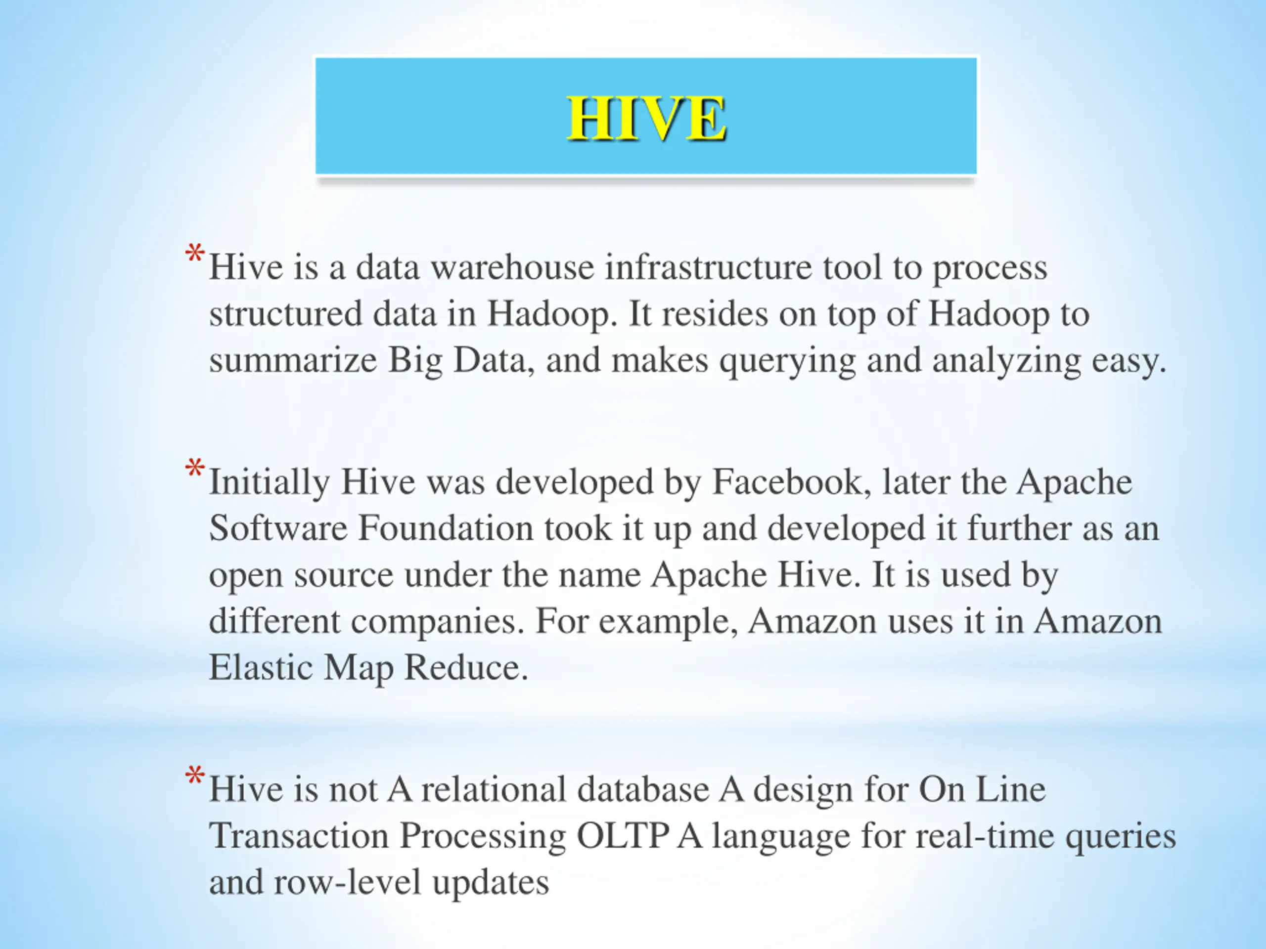 HIVE *Hive is a data warehouse infrastructure tool to process structured data in Hadoop. It resides on top of Hadoop to summarize Big Data, and makes querying and analyzing easy. *Initially Hive was developed by Facebook, later the Apache Software Foundation took it up and developed it further as an open source under the name Apache Hive. It is used by different companies. For example, Amazon uses it in Amazon Elastic Map Reduce. *Hive is not A relational database A design for On Line Transaction Processing OLTP A language for real-time queries and row-level updates