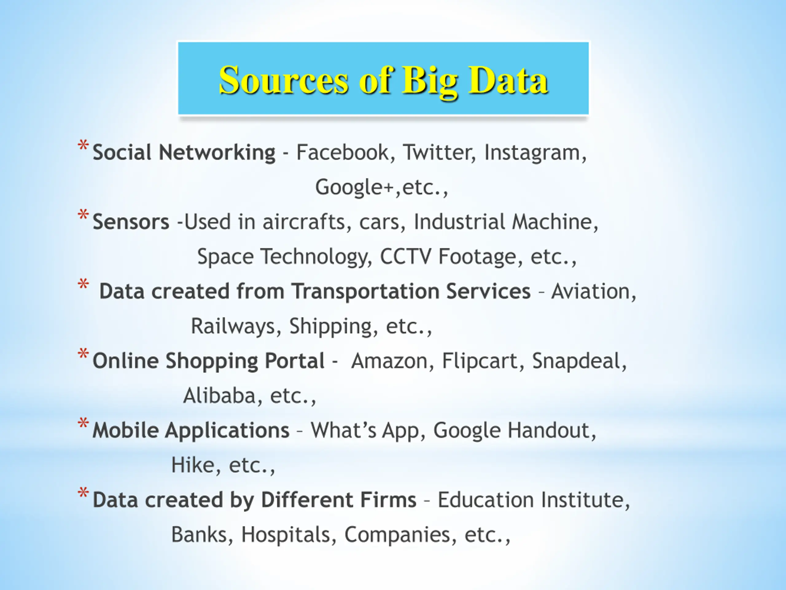 Sources of Big Data *Social Networking - Facebook, Twitter, Instagram, Google+,etc., *Sensors -Used in aircrafts, cars, Industrial Machine, Space Technology, CCTV Footage, etc., *Data created from Transportation Services Aviation, Railways, Shipping, etc., *Online Shopping Portal - Amazon, Flipcart, Snapdeal, Alibaba, etc., *Mobile Applications What s App, Google Handout, Hike, etc., *Data created by Different Firms Education Institute, Banks, Hospitals, Companies, etc.,
