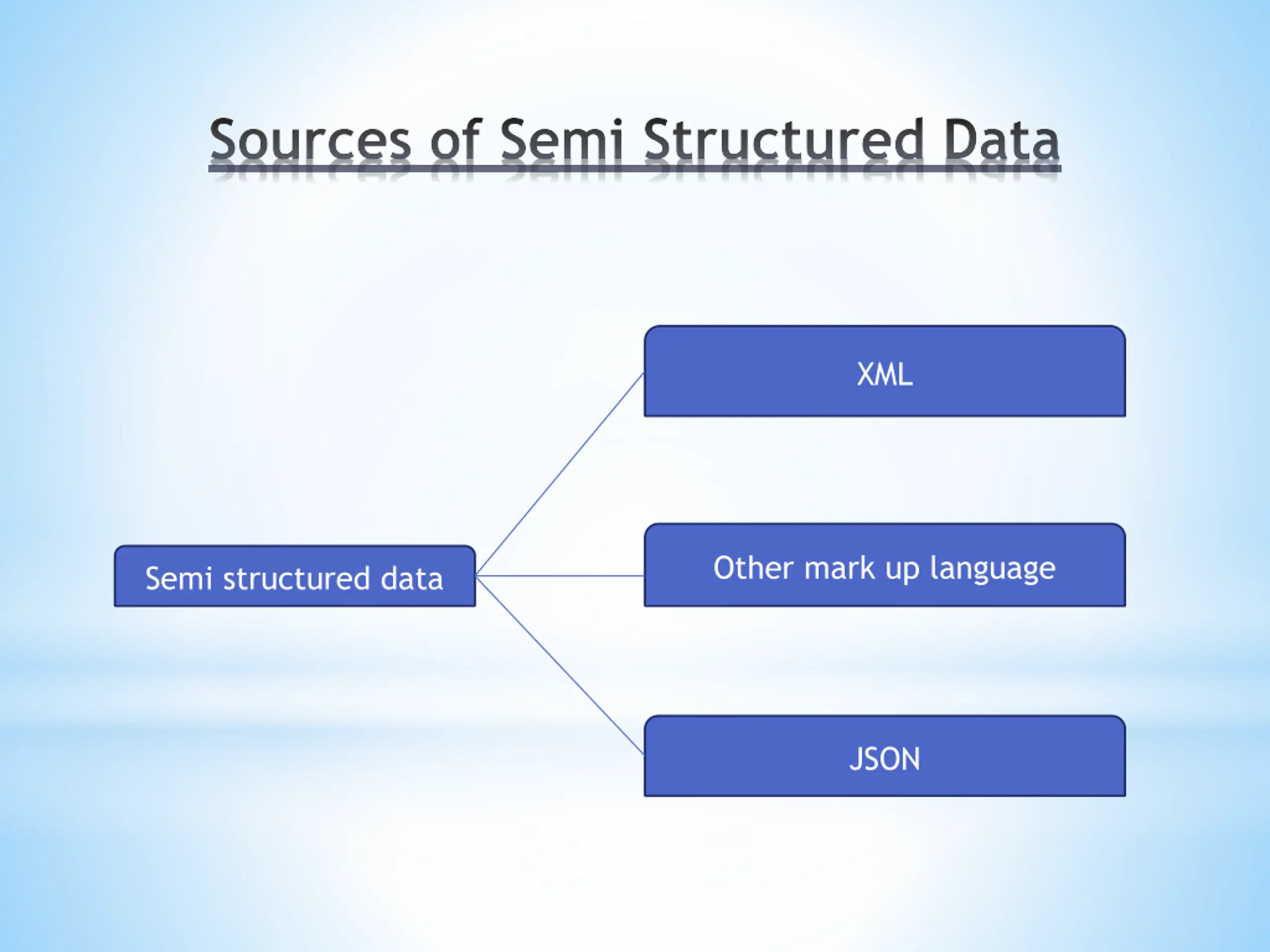 Sources of Semi Structured Data XML Other mark up language Semi structured data JSON