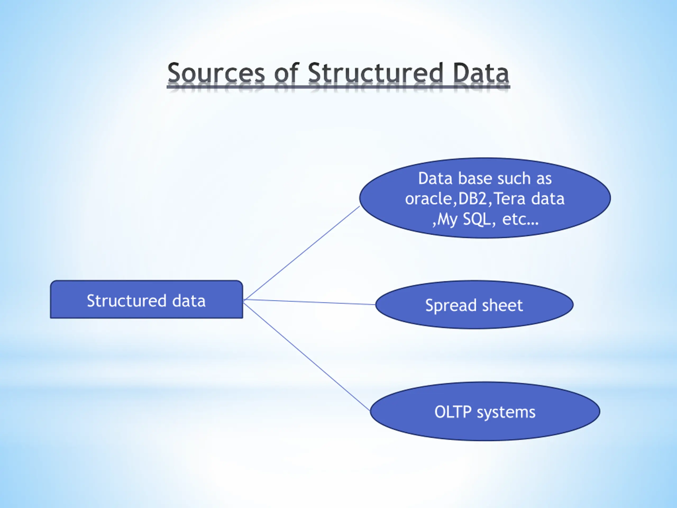 Sources of Structured Data Data base such as oracle,DB2,Tera data ,My SQL, etc Structured data Spread sheet OLTP systems