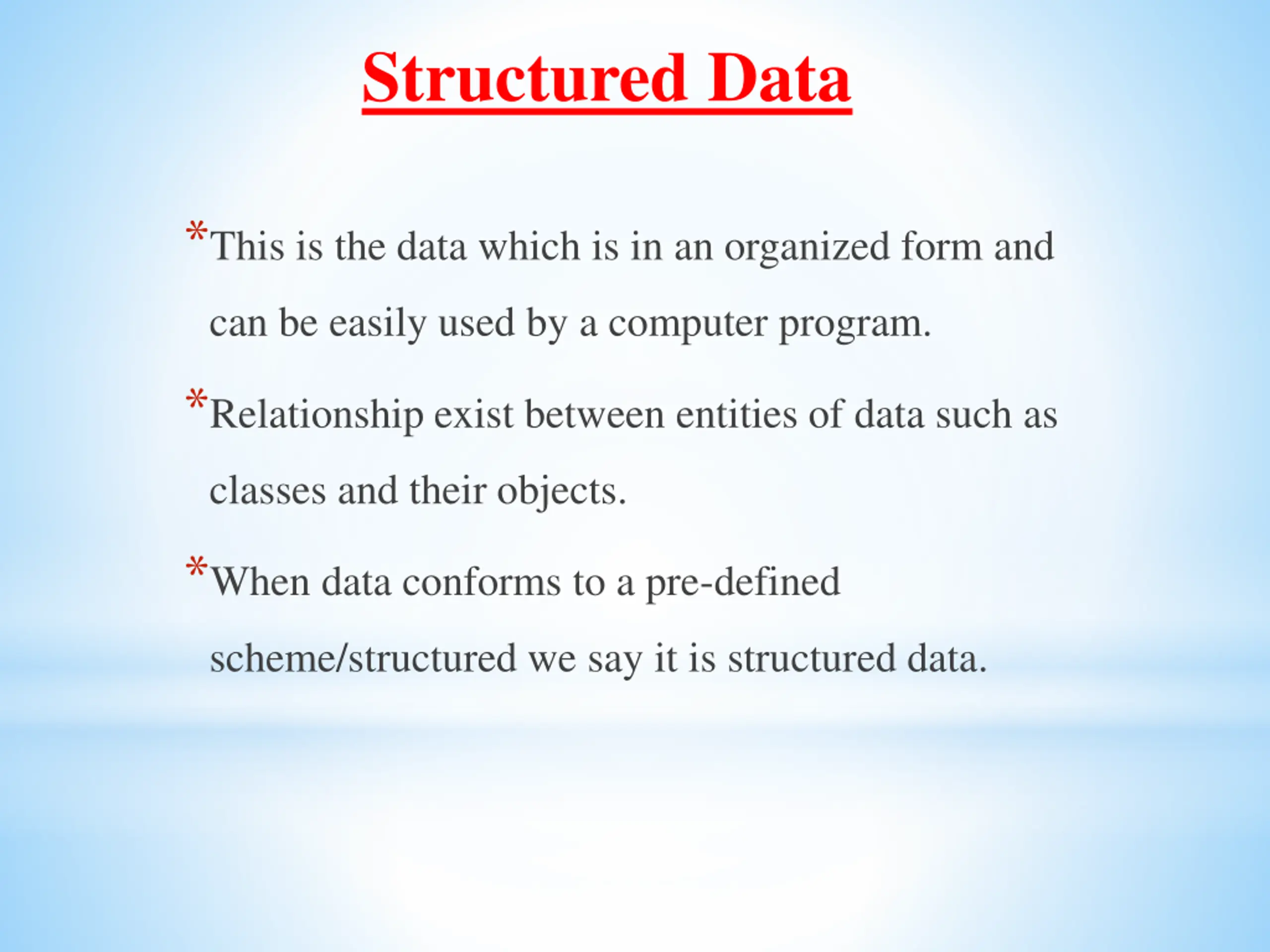 Structured Data *This is the data which is in an organized form and can be easily used by a computer program. *Relationship exist between entities of data such as classes and their objects. *When data conforms to a pre-defined scheme/structured we say it is structured data.