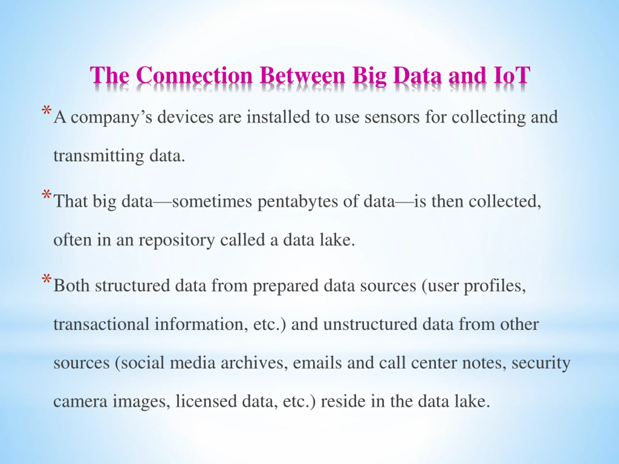The Connection Between Big Data and IoT *A company s devices are installed to use sensors for collecting and transmitting data. *That big data sometimes pentabytes of data is then collected, often in an repository called a data lake. *Both structured data from prepared data sources (user profiles, transactional information, etc.) and unstructured data from other sources (social media archives, emails and call center notes, security camera images, licensed data, etc.) reside in the data lake.