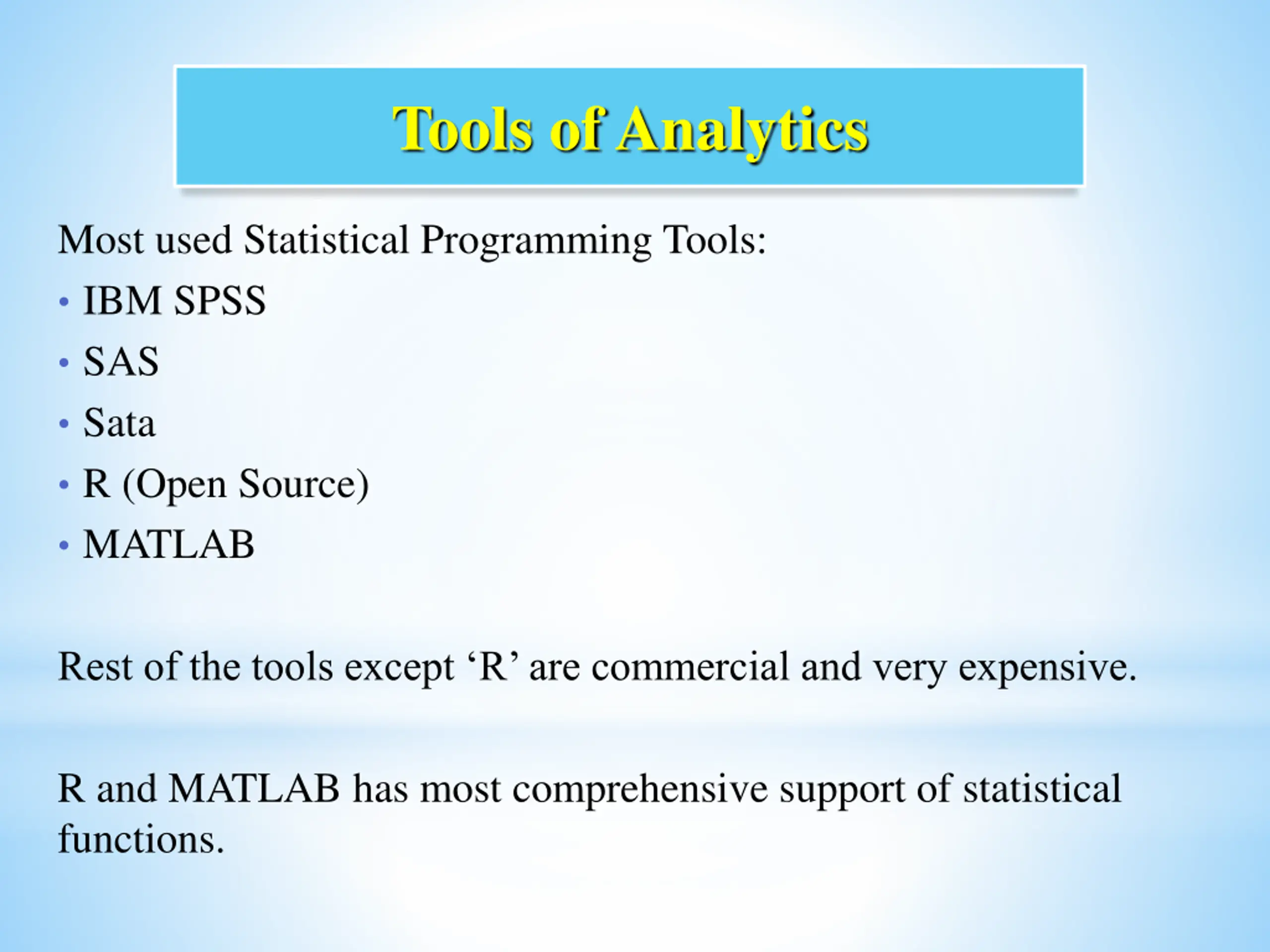 Tools of Analytics Most used Statistical Programming Tools: IBM SPSS SAS Sata R (Open Source) MATLAB Rest of the tools except R are commercial and very expensive. R and MATLAB has most comprehensive support of statistical functions.