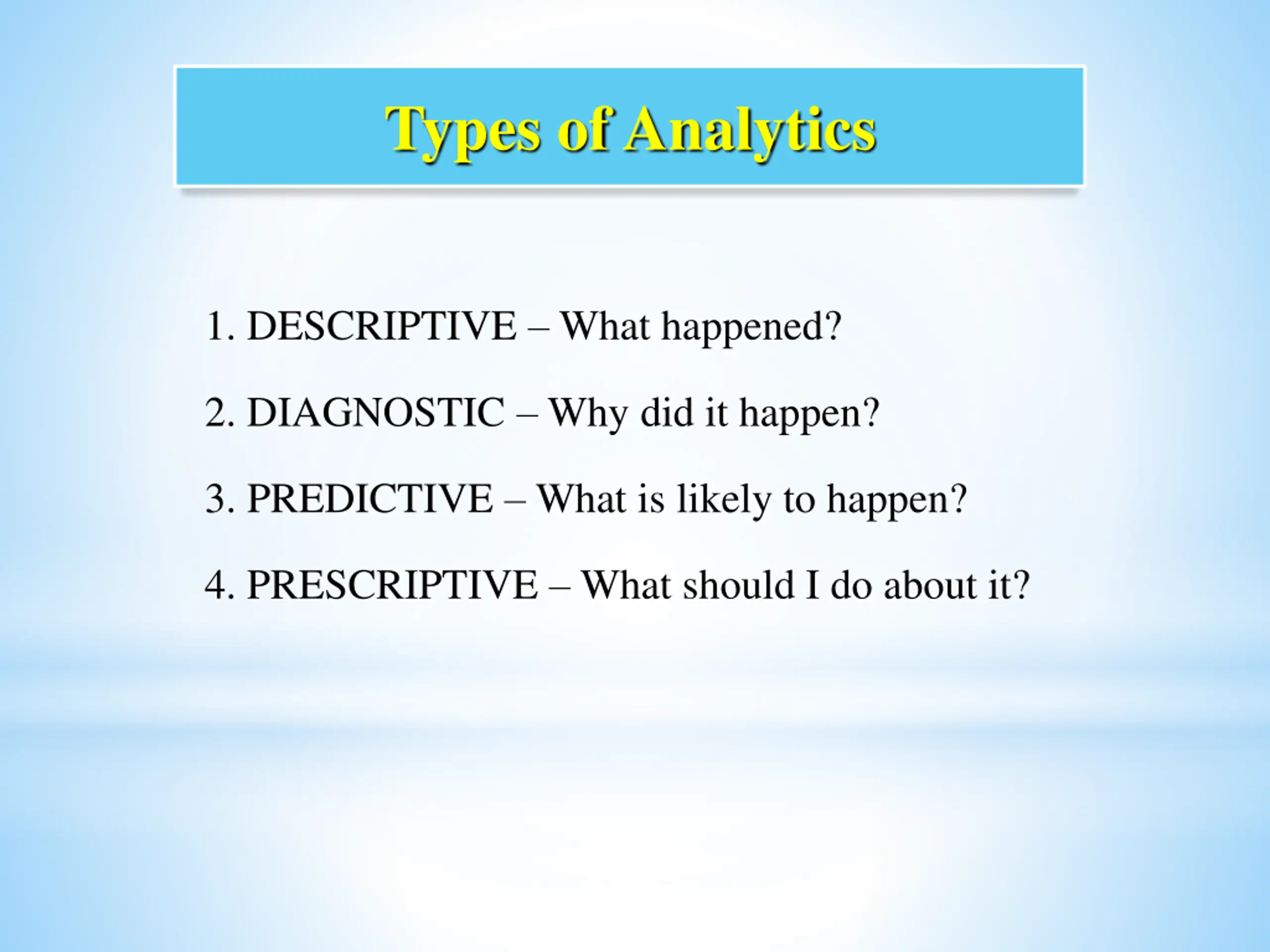 Types of Analytics 1. DESCRIPTIVE What happened? 2. DIAGNOSTIC Why did it happen? 3. PREDICTIVE What is likely to happen? 4. PRESCRIPTIVE What should I do about it?