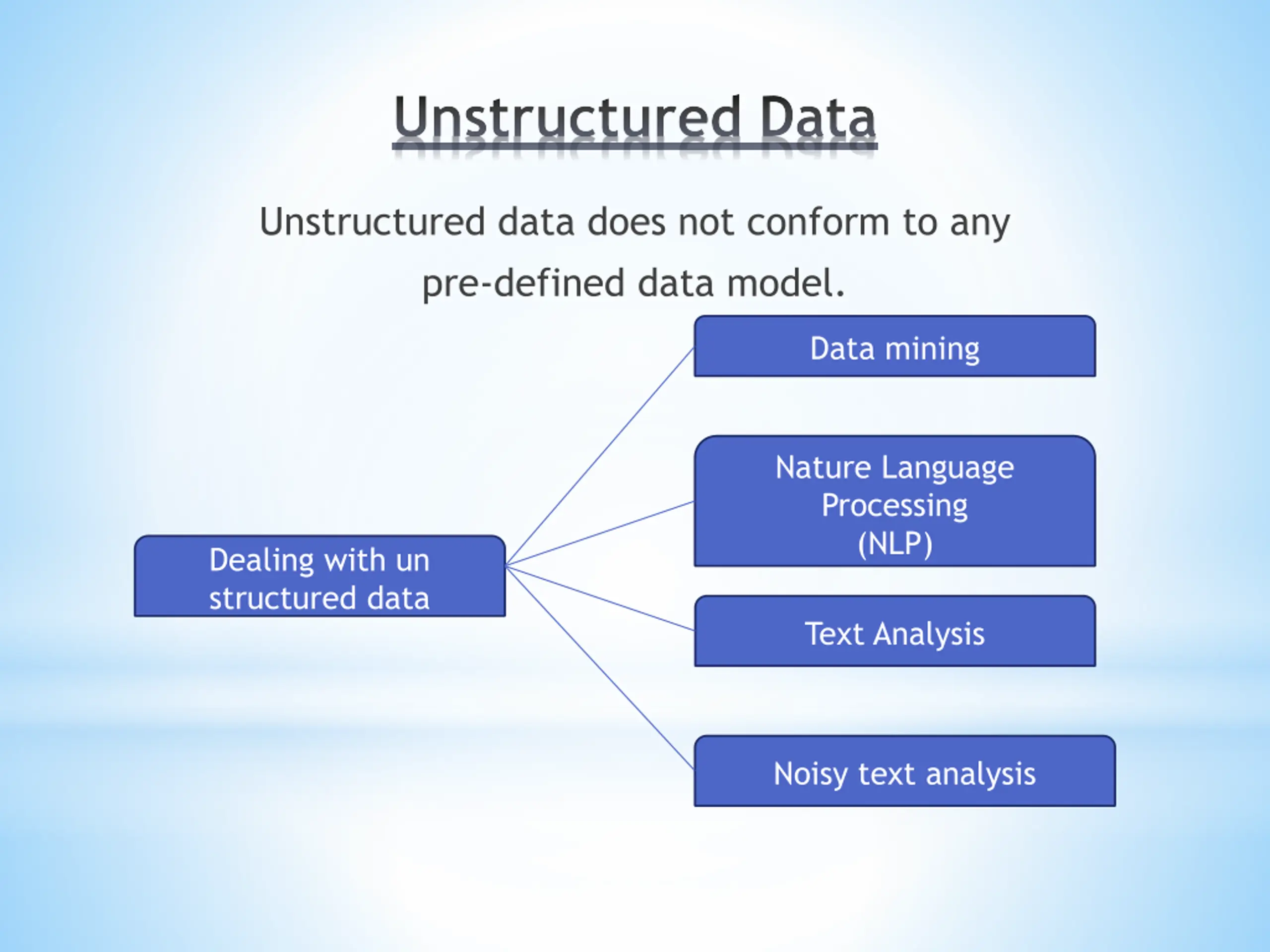 Unstructured Data Unstructured data does not conform to any pre-defined data model. Data mining Nature Language Processing (NLP) Dealing with un structured data Text Analysis Noisy text analysis