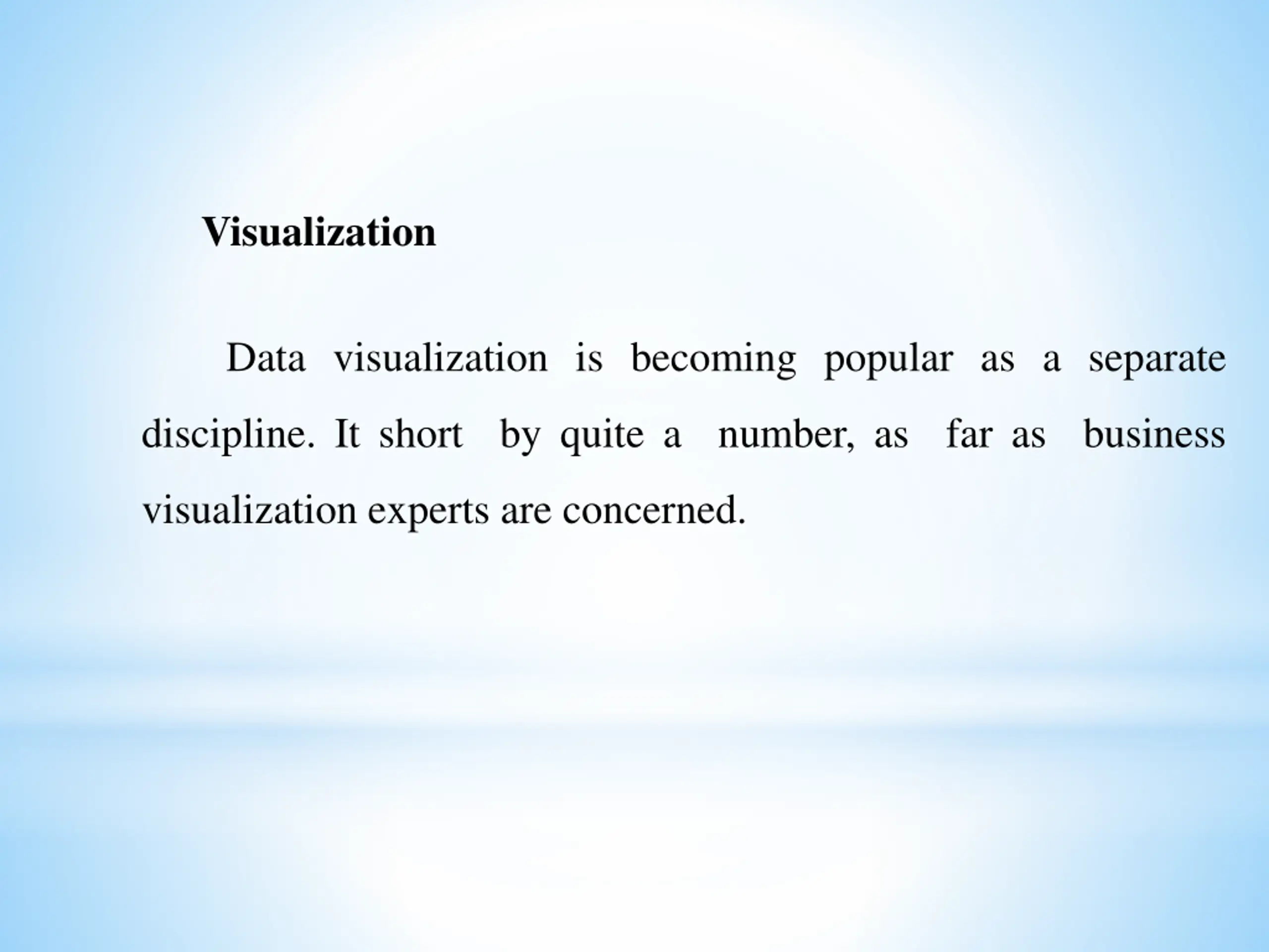 Visualization Data visualization is becoming popular as a separate discipline. It short by quite a number, as far as business visualization experts are concerned.