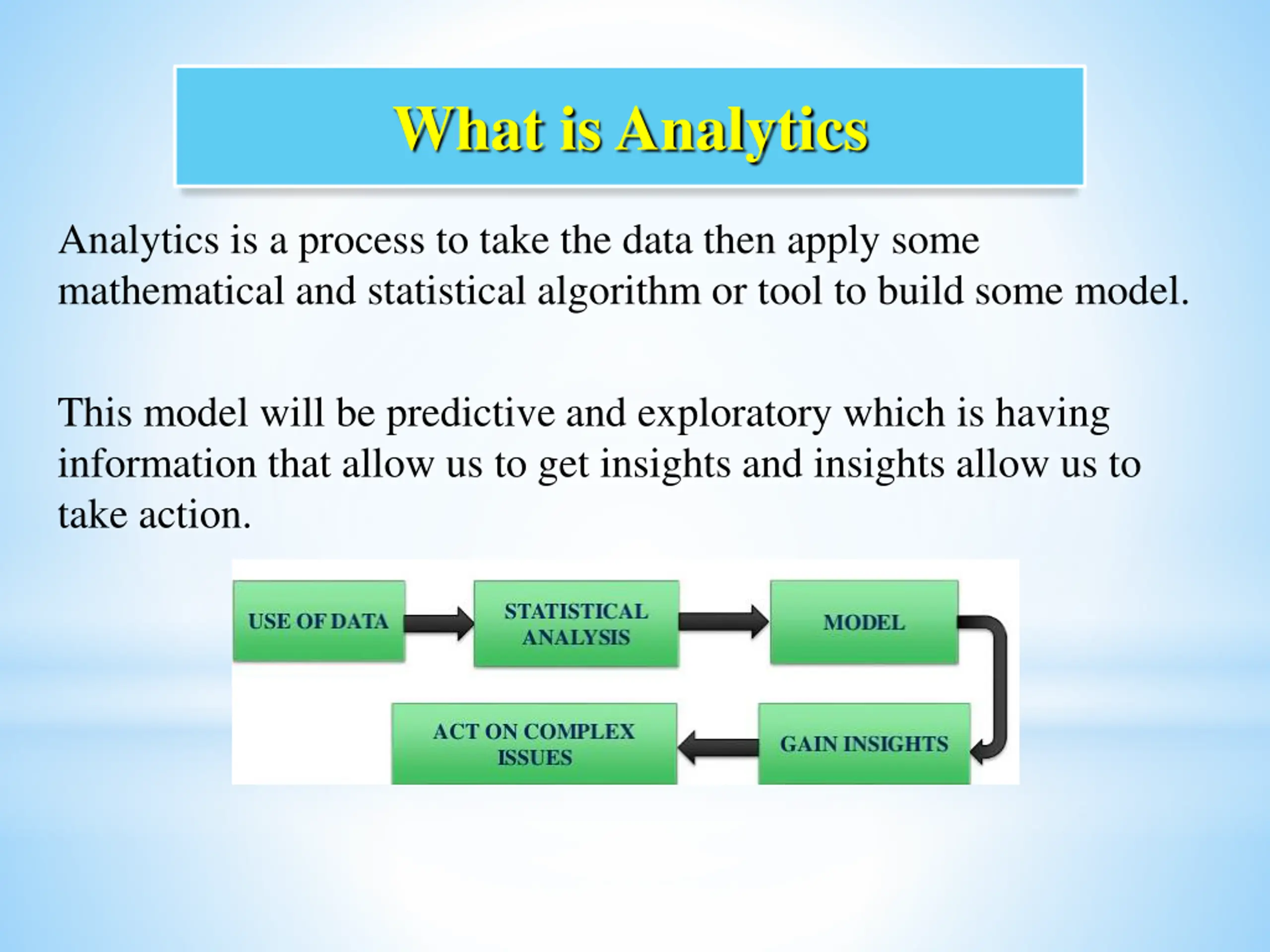 What is Analytics Analytics is a process to take the data then apply some mathematical and statistical algorithm or tool to build some model. This model will be predictive and exploratory which is having information that allow us to get insights and insights allow us to take action.