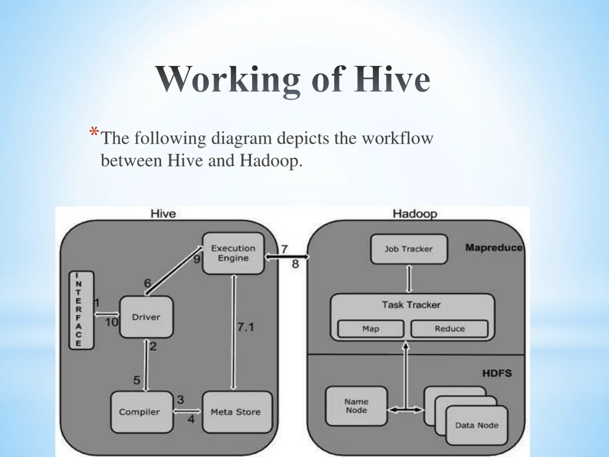 Working of Hive *The following diagram depicts the workflow between Hive and Hadoop.
