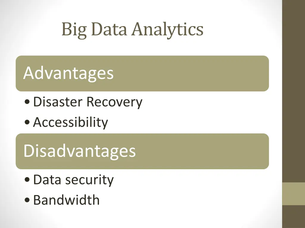 Big Data Analytics Advantages Disaster Recovery Accessibility Disadvantages Data security Bandwidth