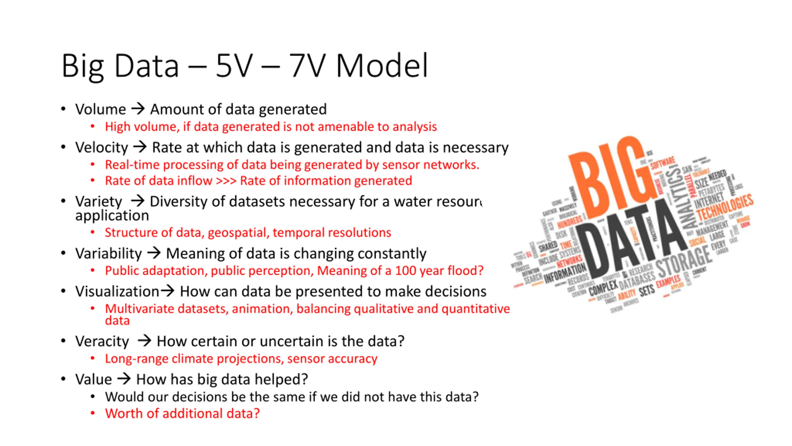Big Data 5V 7V Model Volume Amount of data generated High volume, if data generated is not amenable to analysis Velocity Rate at which data is generated and data is necessary Real-time processing of data being generated by sensor networks. Rate of data inflow >>> Rate of information generated Variety Diversity of datasets necessary for a water resources application Structure of data, geospatial, temporal resolutions Variability Meaning of data is changing constantly Public adaptation, public perception, Meaning of a 100 year flood? Visualization How can data be presented to make decisions Multivariate datasets, animation, balancing qualitative and quantitative data Veracity How certain or uncertain is the data? Long-range climate projections, sensor accuracy Value How has big data helped? Would our decisions be the same if we did not have this data? Worth of additional data?