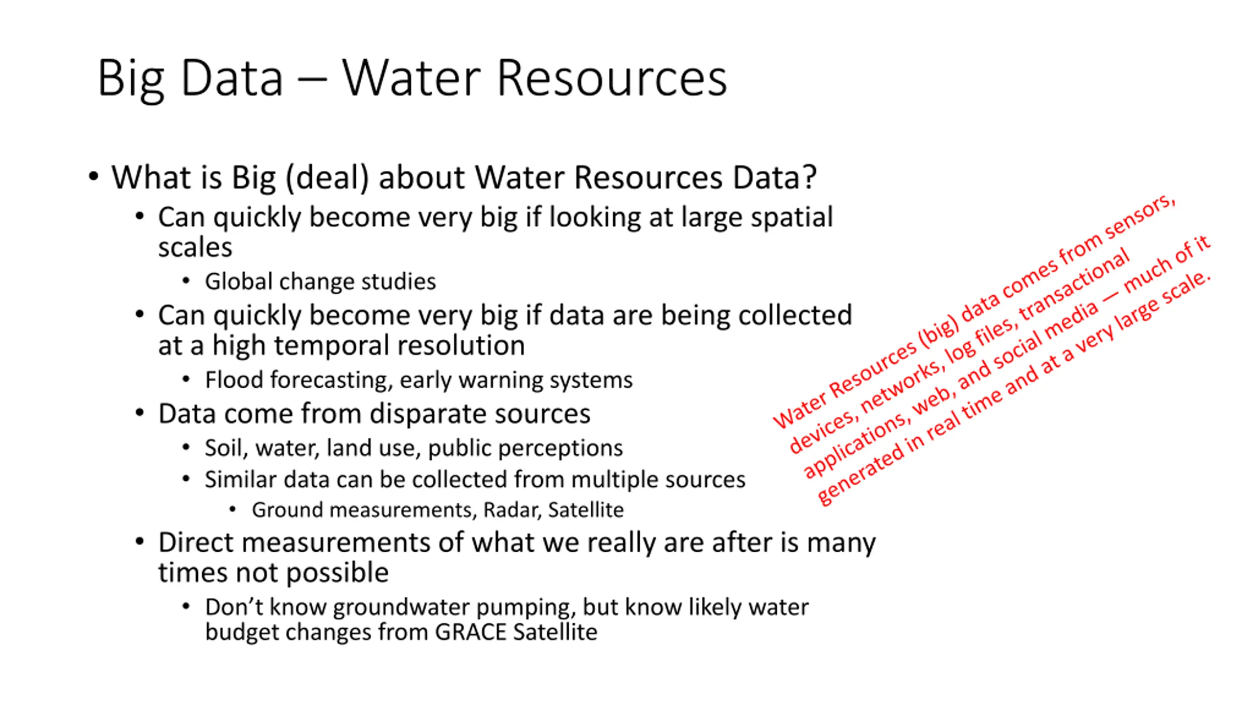 Big Data Water Resources What is Big (deal) about Water Resources Data? Can quickly become very big if looking at large spatial scales Global change studies Can quickly become very big if data are being collected at a high temporal resolution Flood forecasting, early warning systems Data come from disparate sources Soil, water, land use, public perceptions Similar data can be collected from multiple sources Ground measurements, Radar, Satellite Direct measurements of what we really are after is many times not possible Don t know groundwater pumping, but know likely water budget changes from GRACE Satellite