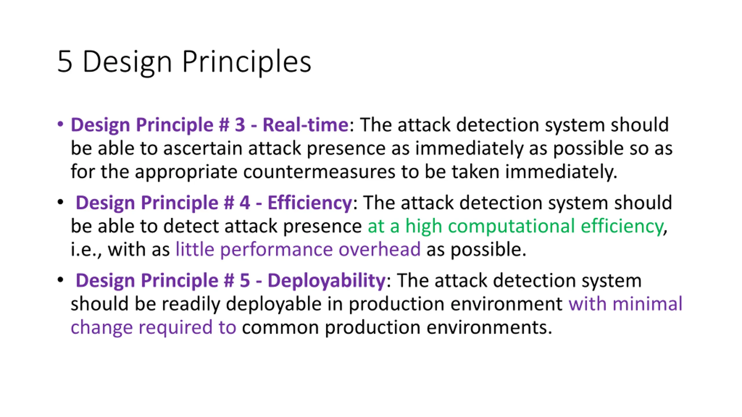 5 Design Principles Design Principle # 3 - Real-time: The attack detection system should be able to ascertain attack presence as immediately as possible so as for the appropriate countermeasures to be taken immediately. Design Principle # 4 - Efficiency: The attack detection system should be able to detect attack presence at a high computational efficiency, i.e., with as little performance overhead as possible. Design Principle # 5 - Deployability: The attack detection system should be readily deployable in production environment with minimal change required to common production environments.
