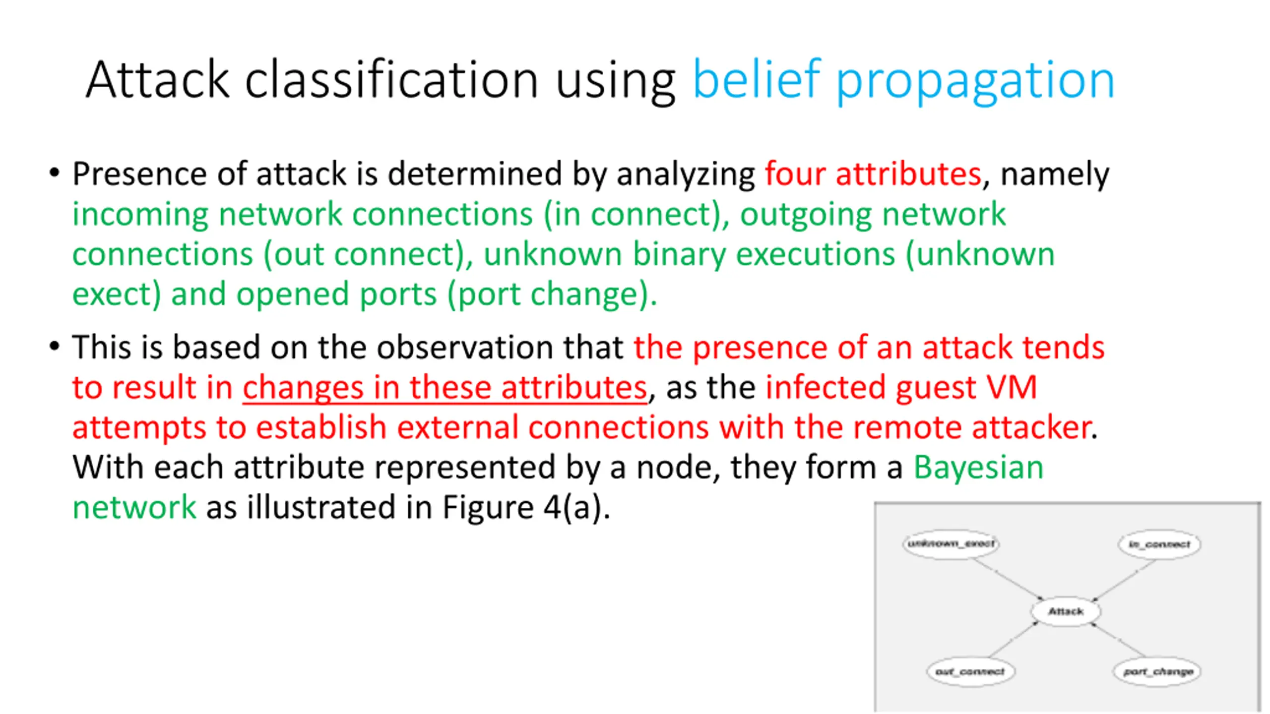 Attack classification using belief propagation Presence of attack is determined by analyzing four attributes, namely incoming network connections (in connect), outgoing network connections (out connect), unknown binary executions (unknown exect) and opened ports (port change). This is based on the observation that the presence of an attack tends to result in changes in these attributes, as the infected guest VM attempts to establish external connections with the remote attacker. With each attribute represented by a node, they form a Bayesian network as illustrated in Figure 4(a).