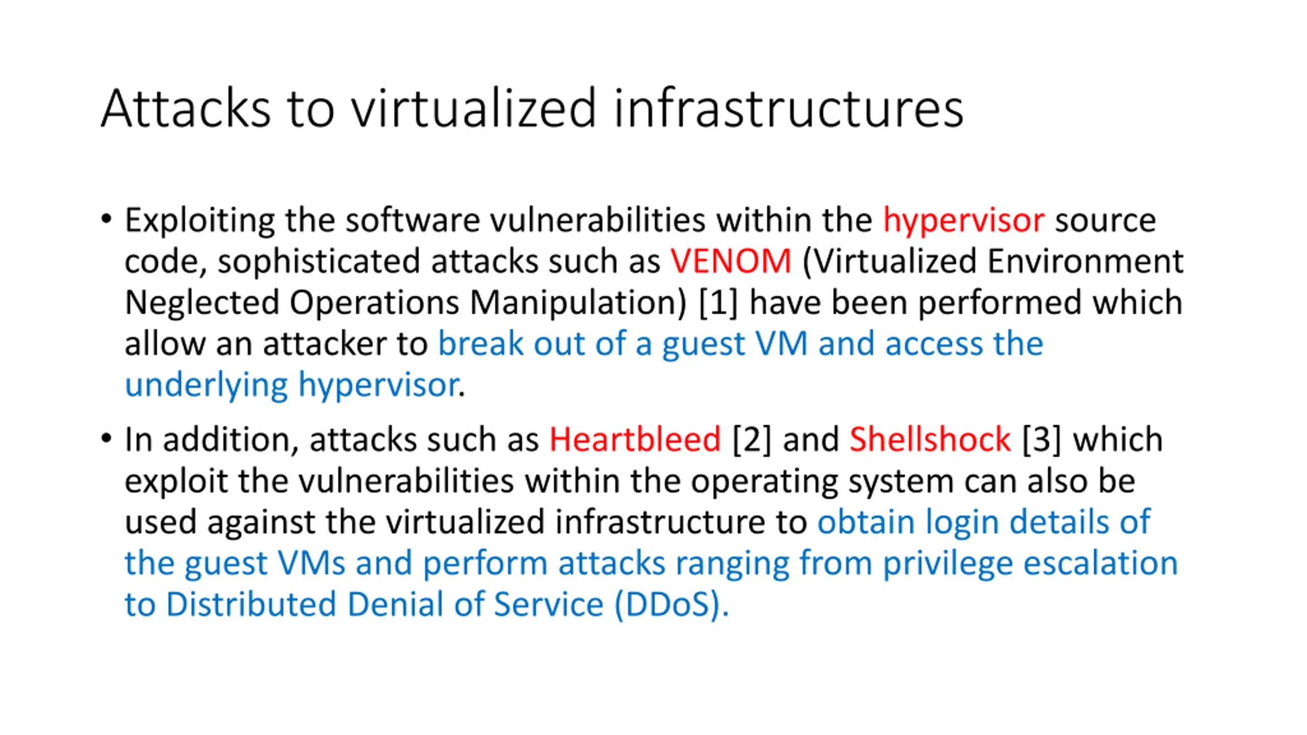 Attacks to virtualized infrastructures Exploiting the software vulnerabilities within the hypervisor source code, sophisticated attacks such as VENOM (Virtualized Environment Neglected Operations Manipulation) [1] have been performed which allow an attacker to break out of a guest VM and access the underlying hypervisor. In addition, attacks such as Heartbleed [2] and Shellshock [3] which exploit the vulnerabilities within the operating system can also be used against the virtualized infrastructure to obtain login details of the guest VMs and perform attacks ranging from privilege escalation to Distributed Denial of Service (DDoS).