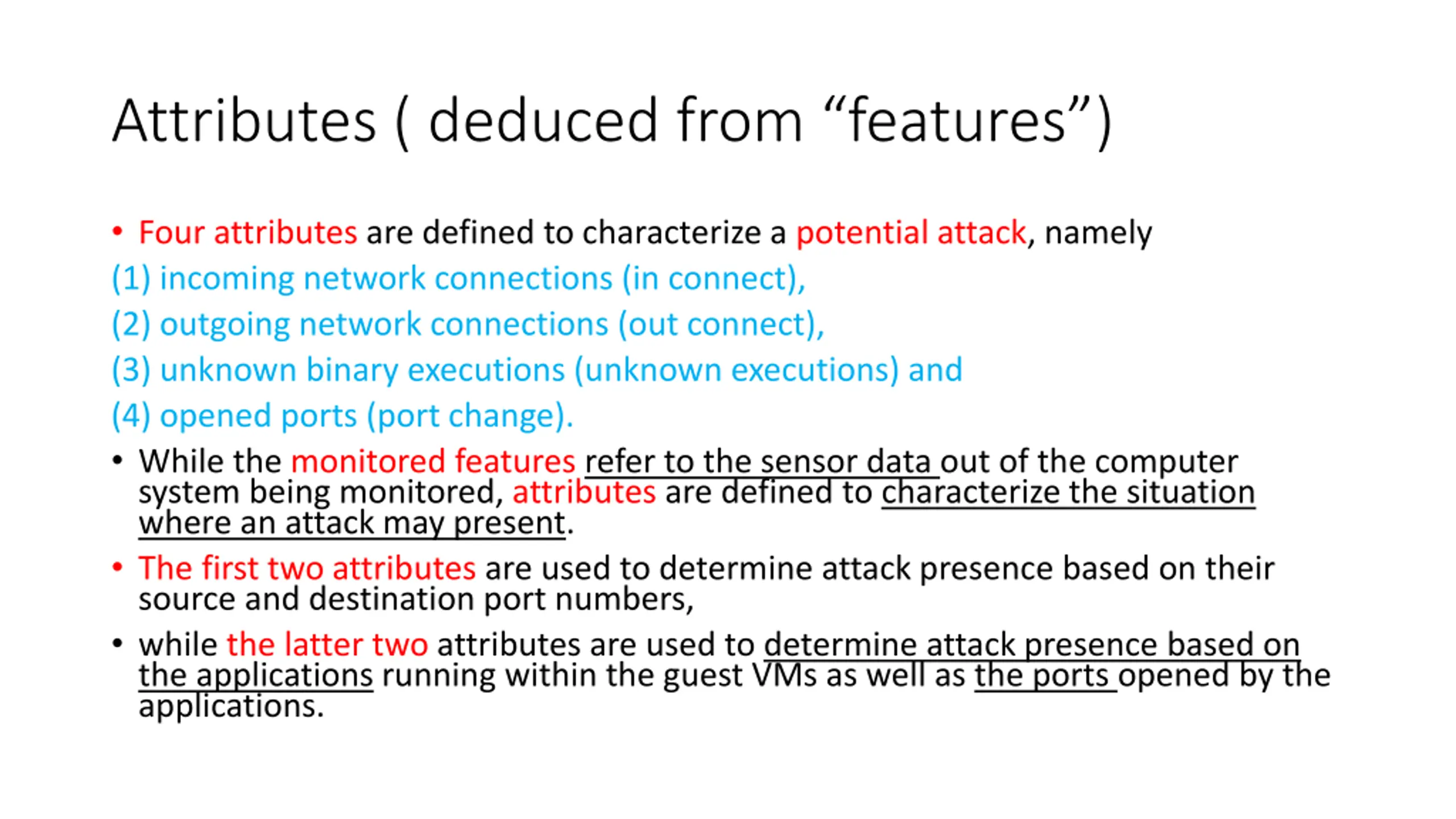 Attributes ( deduced from features) Four attributes are defined to characterize a potential attack, namely (1) incoming network connections (in connect), (2) outgoing network connections (out connect), (3) unknown binary executions (unknown executions) and (4) opened ports (port change). While the monitored features refer to the sensor data out of the computer system being monitored, attributes are defined to characterize the situation where an attack may present. The first two attributes are used to determine attack presence based on their source and destination port numbers, while the latter two attributes are used to determine attack presence based on the applications running within the guest VMs as well as the ports opened by the applications.