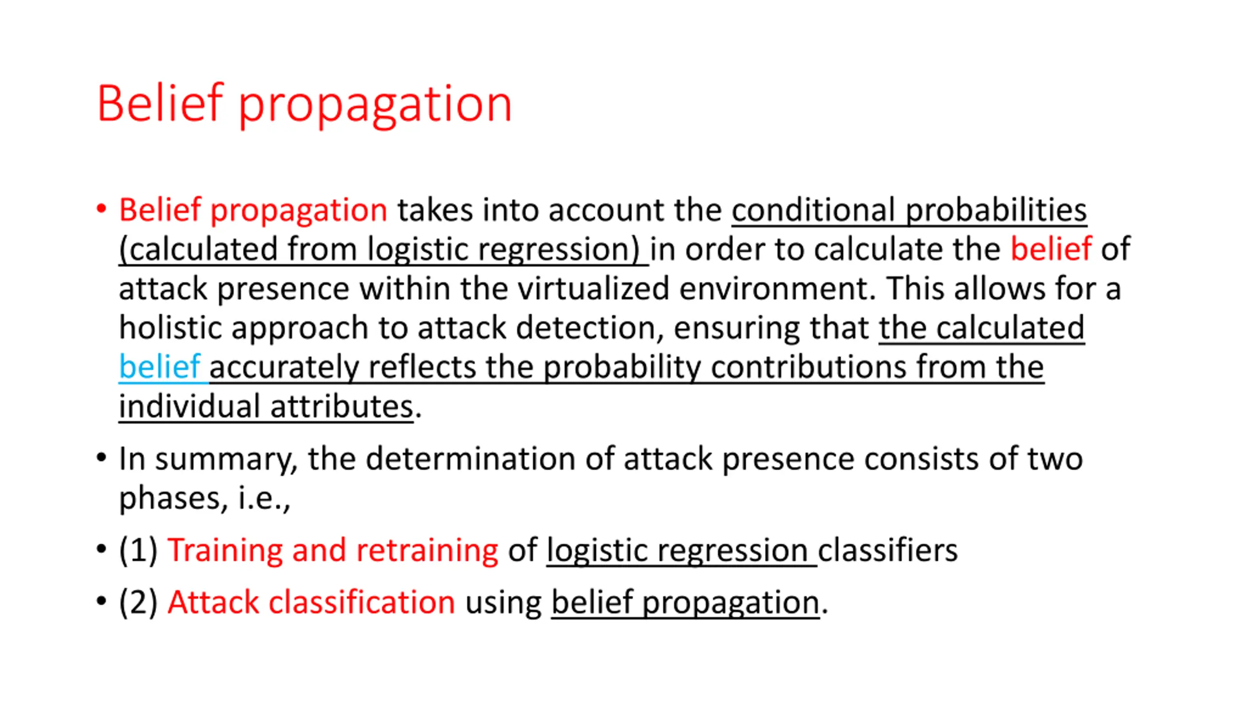 Belief propagation Belief propagation takes into account the conditional probabilities (calculated from logistic regression) in order to calculate the belief of attack presence within the virtualized environment. This allows for a holistic approach to attack detection, ensuring that the calculated belief accurately reflects the probability contributions from the individual attributes. In summary, the determination of attack presence consists of two phases, i.e., (1) Training and retraining of logistic regression classifiers (2) Attack classification using belief propagation.