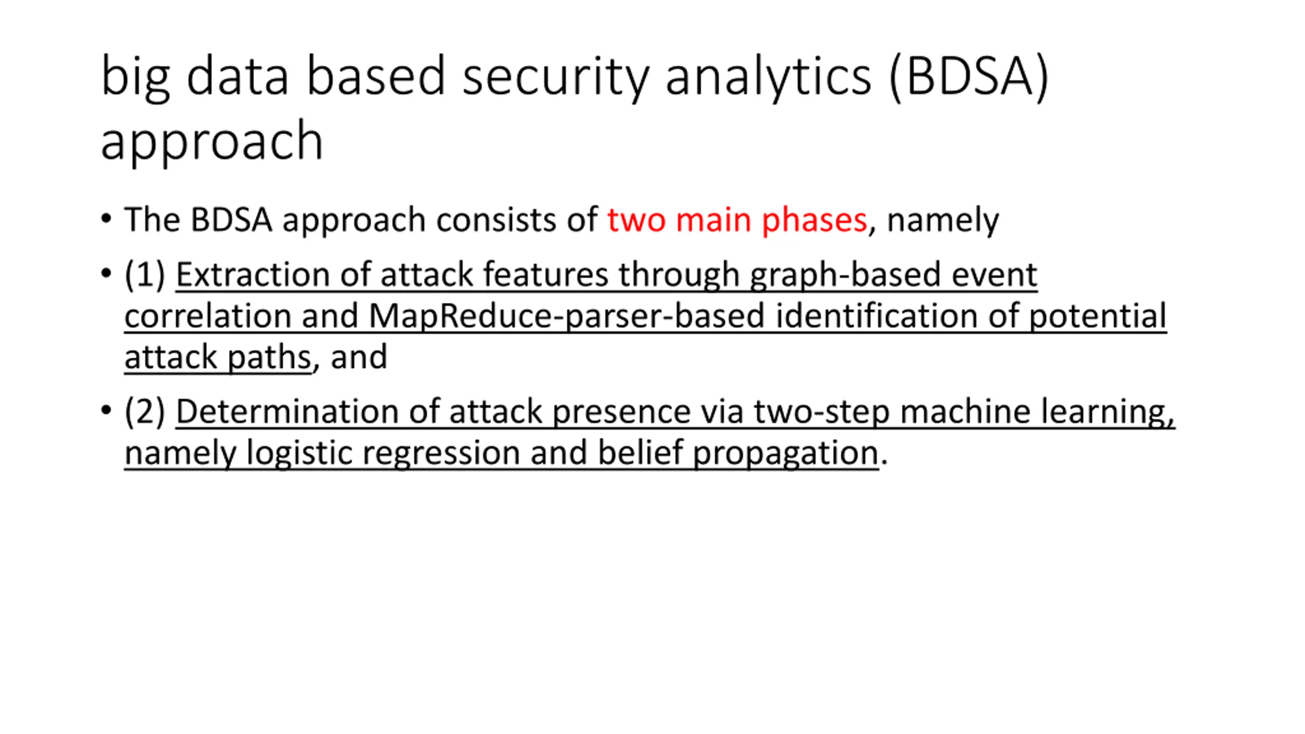 big data based security analytics (BDSA) approach The BDSA approach consists of two main phases, namely (1) Extraction of attack features through graph-based event correlation and MapReduce-parser-based identification of potential attack paths, and (2) Determination of attack presence via two-step machine learning, namely logistic regression and belief propagation.