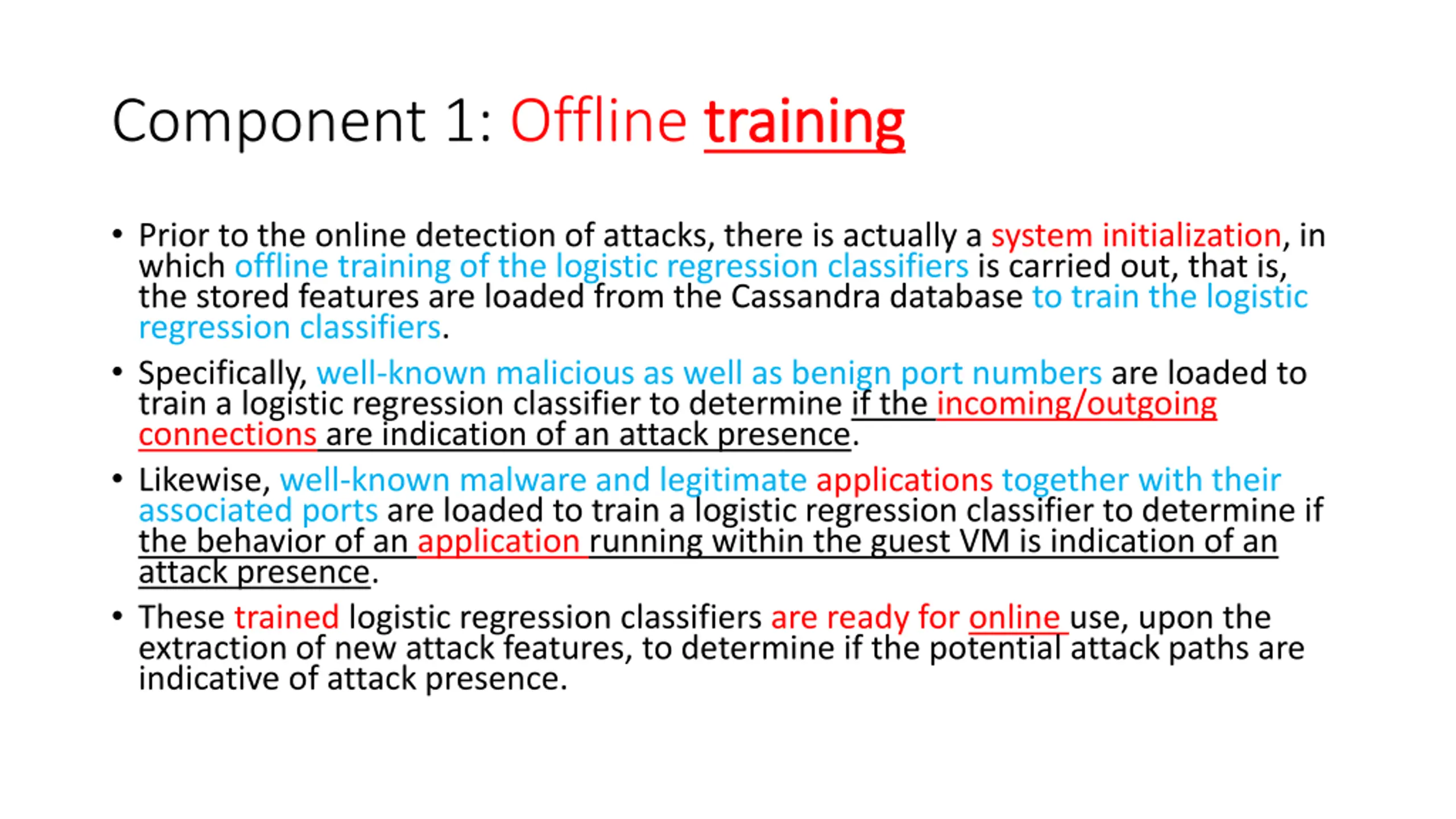 Component 1: Offline training training Prior to the online detection of attacks, there is actually a system initialization, in which offline training of the logistic regression classifiers is carried out, that is, the stored features are loaded from the Cassandra database to train the logistic regression classifiers. Specifically, well-known malicious as well as benign port numbers are loaded to train a logistic regression classifier to determine if the incoming/outgoing connections are indication of an attack presence. Likewise, well-known malware and legitimate applications together with their associated ports are loaded to train a logistic regression classifier to determine if the behavior of an application running within the guest VM is indication of an attack presence. These trained logistic regression classifiers are ready for online use, upon the extraction of new attack features, to determine if the potential attack paths are indicative of attack presence.