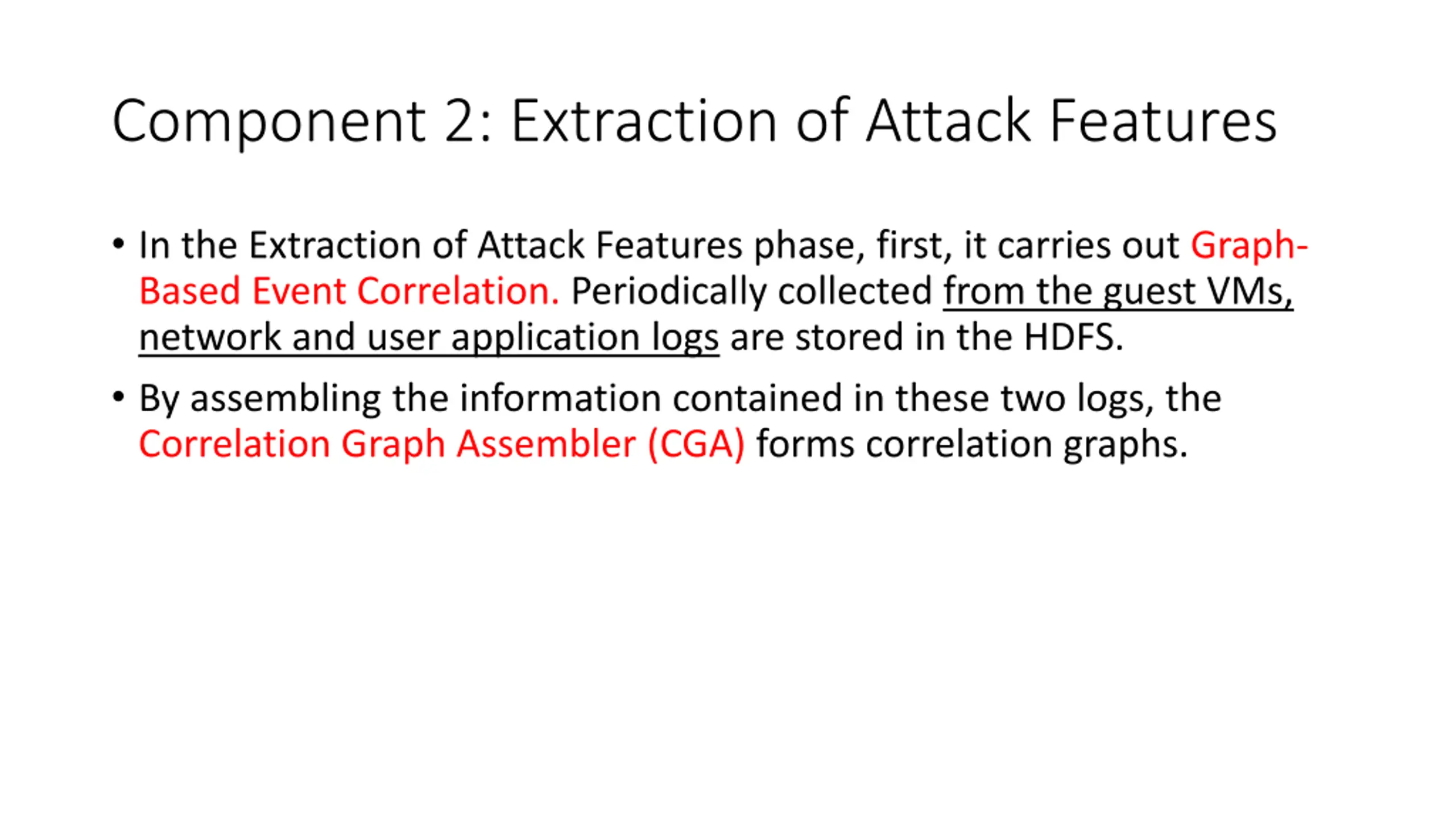 Component 2: Extraction of Attack Features In the Extraction of Attack Features phase, first, it carries out Graph- Based Event Correlation. Periodically collected from the guest VMs, network and user application logs are stored in the HDFS. By assembling the information contained in these two logs, the Correlation Graph Assembler (CGA) forms correlation graphs.