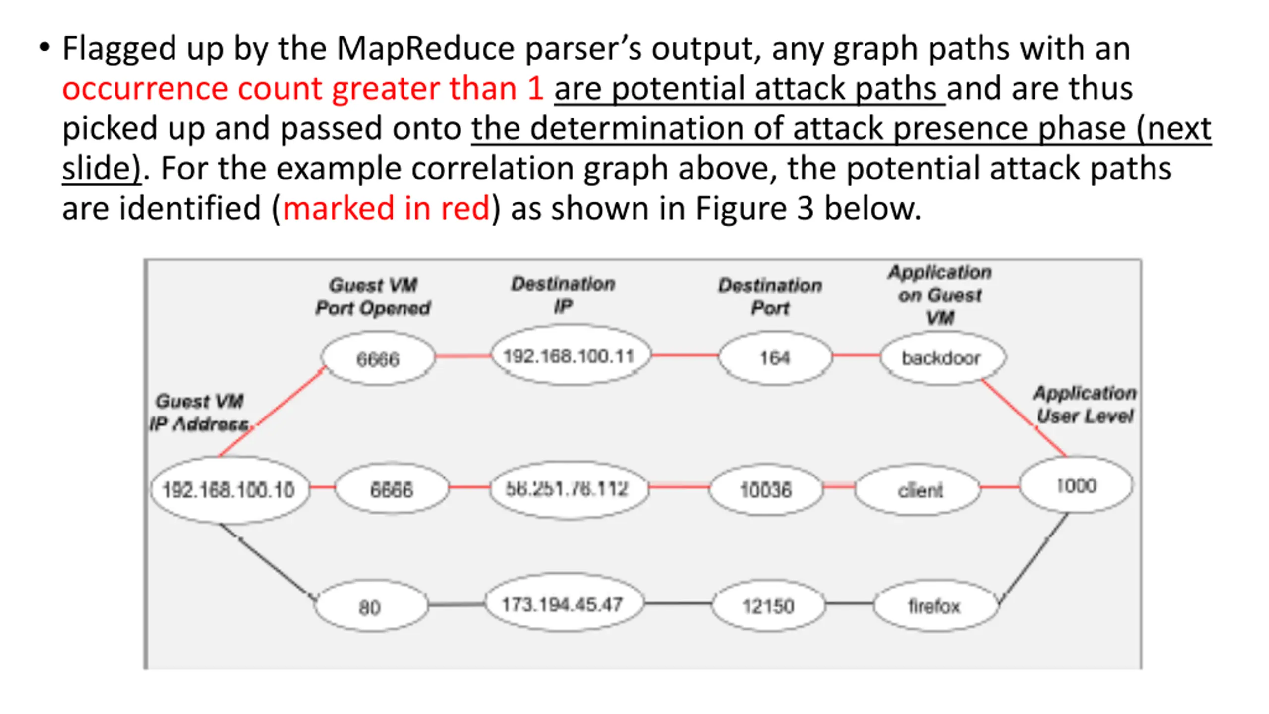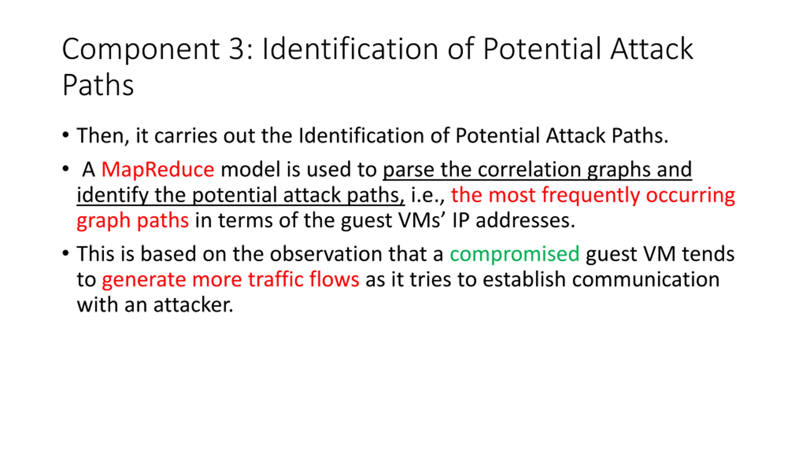 Component 3: Identification of Potential Attack Paths Then, it carries out the Identification of Potential Attack Paths. A MapReduce model is used to parse the correlation graphs and identify the potential attack paths, i.e., the most frequently occurring graph paths in terms of the guest VMs IP addresses. This is based on the observation that a compromised guest VM tends to generate more traffic flows as it tries to establish communication with an attacker.