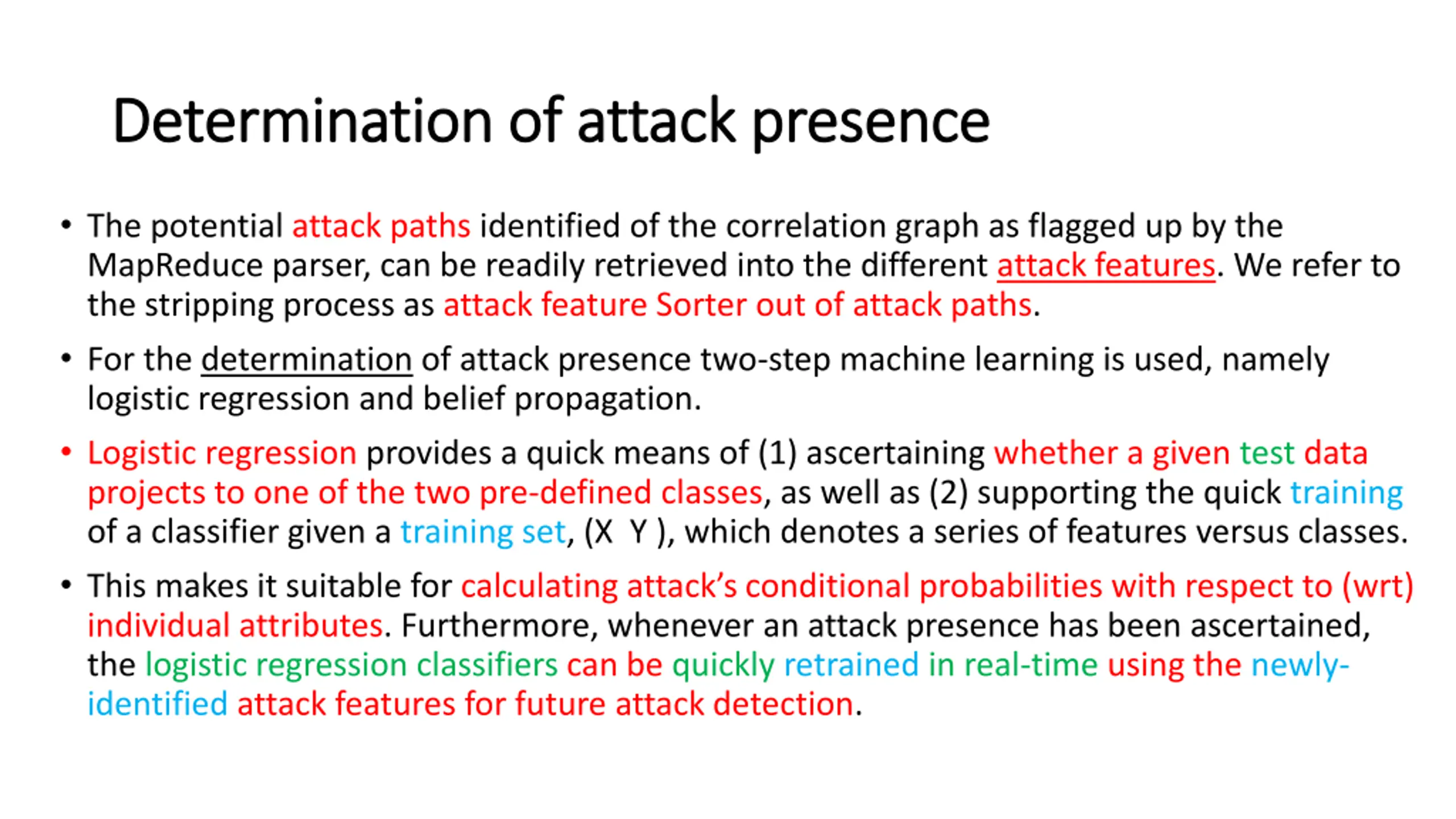 Determination of attack presence Determination of attack presence The potential attack paths identified of the correlation graph as flagged up by the MapReduce parser, can be readily retrieved into the different attack features. We refer to the stripping process as attack feature Sorter out of attack paths. For the determination of attack presence two-step machine learning is used, namely logistic regression and belief propagation. Logistic regression provides a quick means of (1) ascertaining whether a given test data projects to one of the two pre-defined classes, as well as (2) supporting the quick training of a classifier given a training set, (X Y ), which denotes a series of features versus classes. This makes it suitable for calculating attack s conditional probabilities with respect to (wrt) individual attributes. Furthermore, whenever an attack presence has been ascertained, the logistic regression classifiers can be quickly retrained in real-time using the newly- identified attack features for future attack detection.