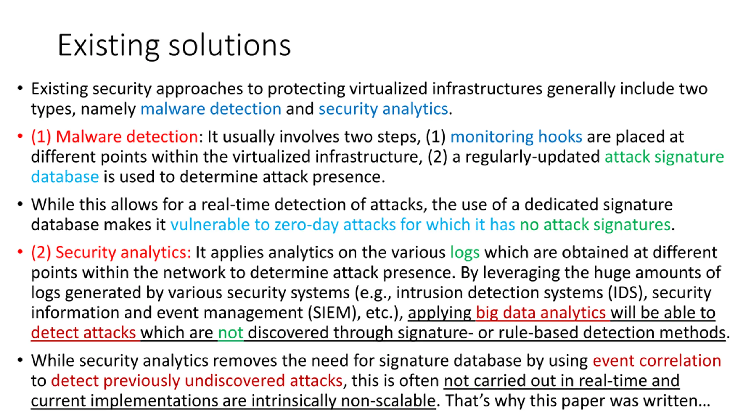 Existing solutions Existing security approaches to protecting virtualized infrastructures generally include two types, namely malware detection and security analytics. (1) Malware detection: It usually involves two steps, (1) monitoring hooks are placed at different points within the virtualized infrastructure, (2) a regularly-updated attack signature database is used to determine attack presence. While this allows for a real-time detection of attacks, the use of a dedicated signature database makes it vulnerable to zero-day attacks for which it has no attack signatures. (2) Security analytics: It applies analytics on the various logs which are obtained at different points within the network to determine attack presence. By leveraging the huge amounts of logs generated by various security systems (e.g., intrusion detection systems (IDS), security information and event management (SIEM), etc.), applying big data analytics will be able to detect attacks which are not discovered through signature- or rule-based detection methods. While security analytics removes the need for signature database by using event correlation to detect previously undiscovered attacks, this is often not carried out in real-time and current implementations are intrinsically non-scalable. That s why this paper was written