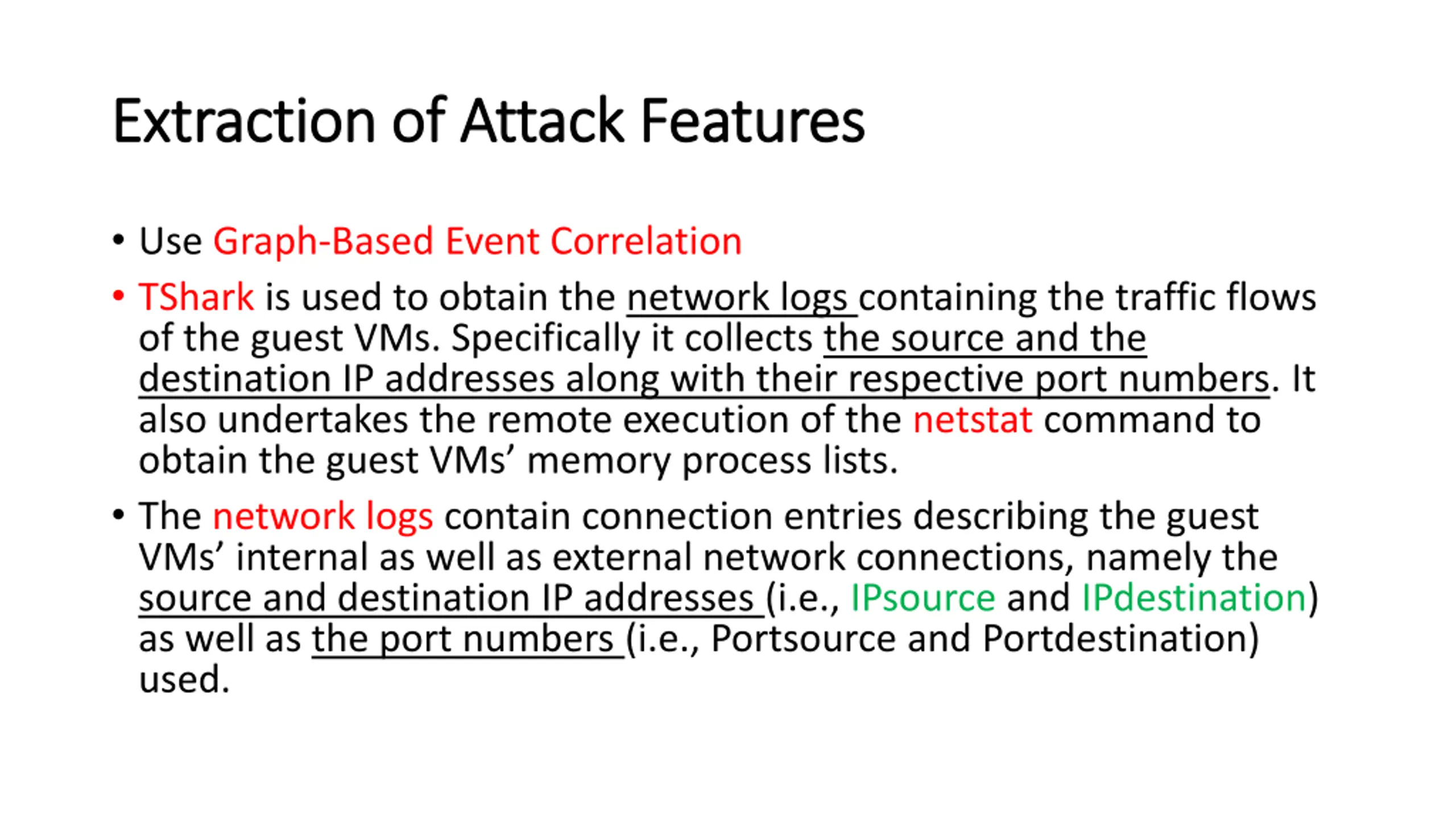 Extraction of Attack Features Extraction of Attack Features Use Graph-Based Event Correlation TShark is used to obtain the network logs containing the traffic flows of the guest VMs. Specifically it collects the source and the destination IP addresses along with their respective port numbers. It also undertakes the remote execution of the netstat command to obtain the guest VMs memory process lists. The network logs contain connection entries describing the guest VMs internal as well as external network connections, namely the source and destination IP addresses (i.e., IPsource and IPdestination) as well as the port numbers (i.e., Portsource and Portdestination) used.