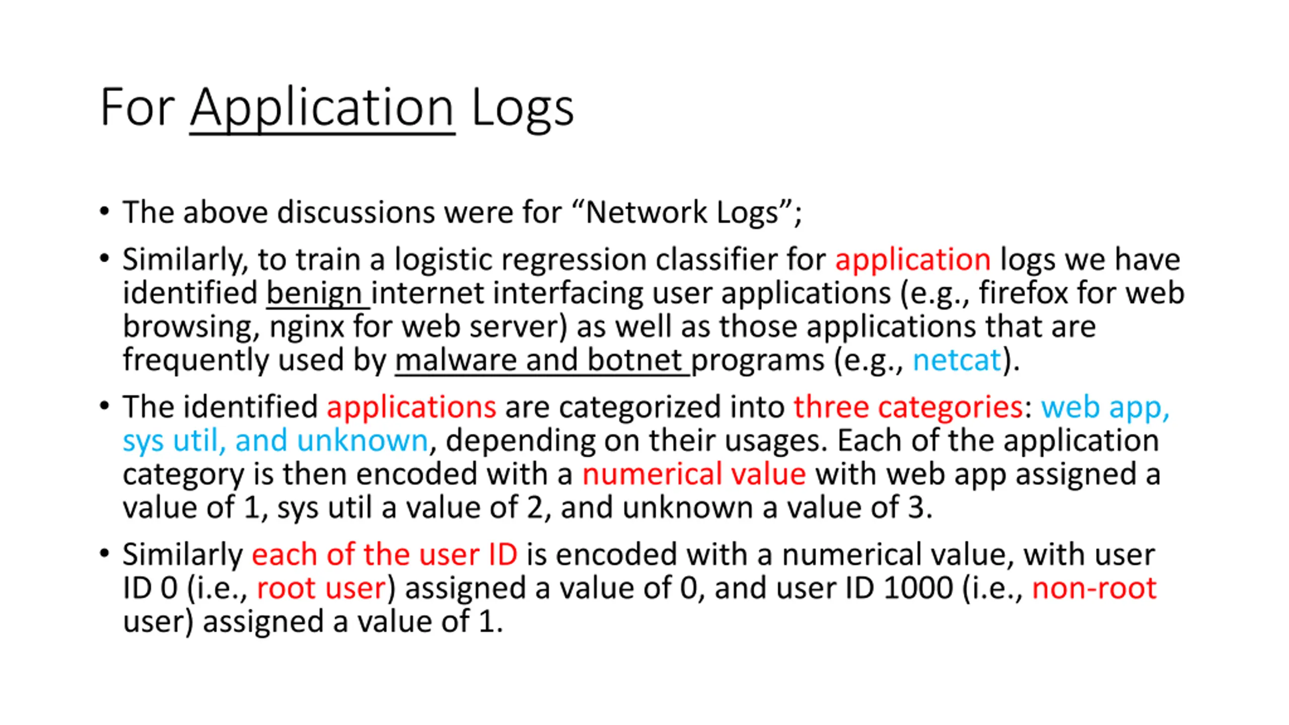 For Application Logs The above discussions were for Network Logs ; Similarly, to train a logistic regression classifier for application logs we have identified benign internet interfacing user applications (e.g., firefox for web browsing, nginx for web server) as well as those applications that are frequently used by malware and botnet programs (e.g., netcat). The identified applications are categorized into three categories: web app, sys util, and unknown, depending on their usages. Each of the application category is then encoded with a numerical value with web app assigned a value of 1, sys util a value of 2, and unknown a value of 3. Similarly each of the user ID is encoded with a numerical value, with user ID 0 (i.e., root user) assigned a value of 0, and user ID 1000 (i.e., non-root user) assigned a value of 1.