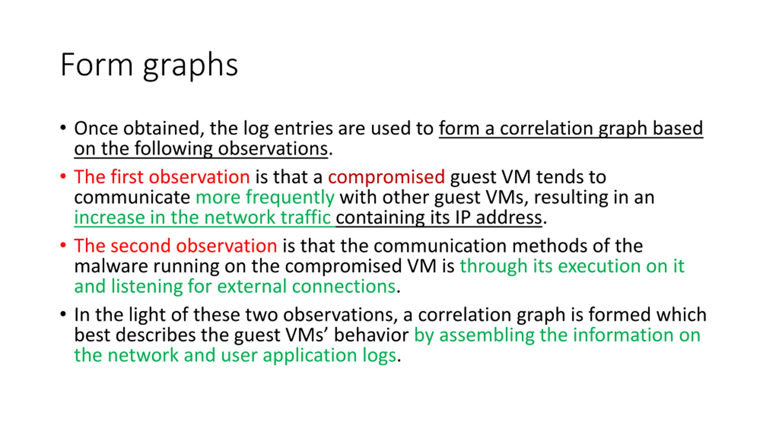 Form graphs Once obtained, the log entries are used to form a correlation graph based on the following observations. The first observation is that a compromised guest VM tends to communicate more frequently with other guest VMs, resulting in an increase in the network traffic containing its IP address. The second observation is that the communication methods of the malware running on the compromised VM is through its execution on it and listening for external connections. In the light of these two observations, a correlation graph is formed which best describes the guest VMs behavior by assembling the information on the network and user application logs.