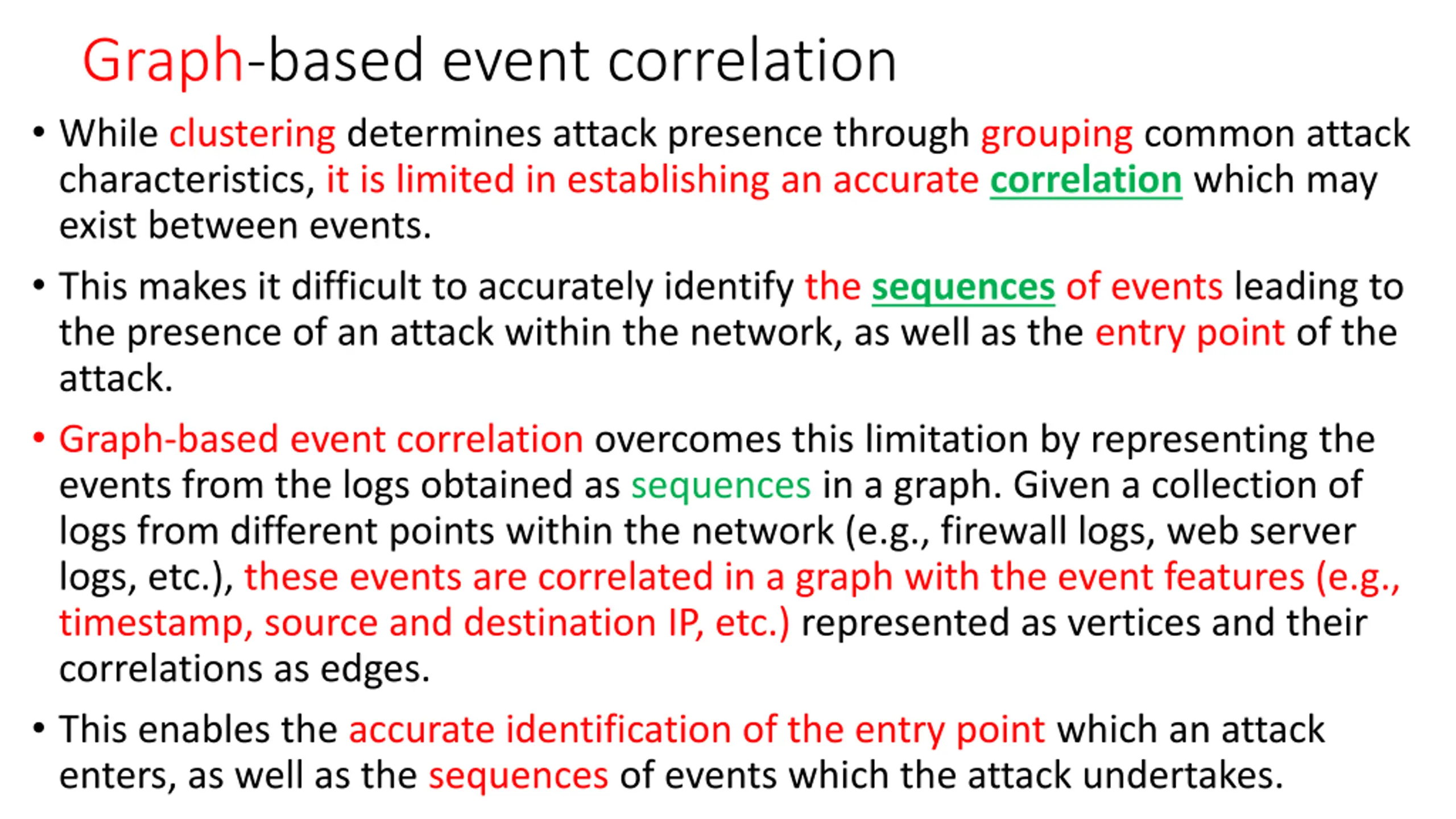 Graph-based event correlation While clustering determines attack presence through grouping common attack characteristics, it is limited in establishing an accurate correlation which may exist between events. This makes it difficult to accurately identify the sequences of events leading to the presence of an attack within the network, as well as the entry point of the attack. Graph-based event correlation overcomes this limitation by representing the events from the logs obtained as sequences in a graph. Given a collection of logs from different points within the network (e.g., firewall logs, web server logs, etc.), these events are correlated in a graph with the event features (e.g., timestamp, source and destination IP, etc.) represented as vertices and their correlations as edges. This enables the accurate identification of the entry point which an attack enters, as well as the sequences of events which the attack undertakes.