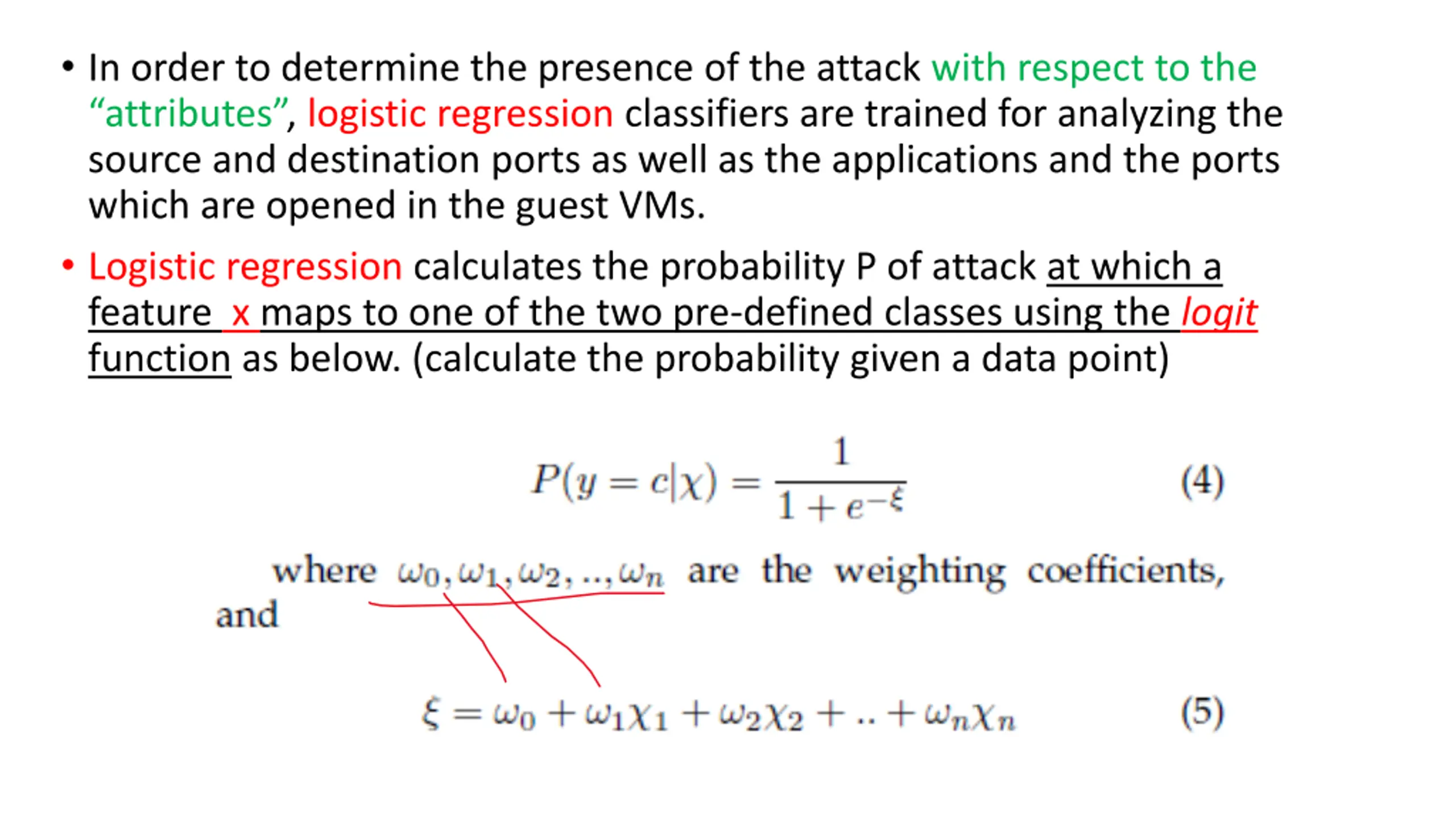 In order to determine the presence of the attack with respect to the attributes , logistic regression classifiers are trained for analyzing the source and destination ports as well as the applications and the ports which are opened in the guest VMs. Logistic regression calculates the probability P of attack at which a feature x maps to one of the two pre-defined classes using the logit function as below. (calculate the probability given a data point)