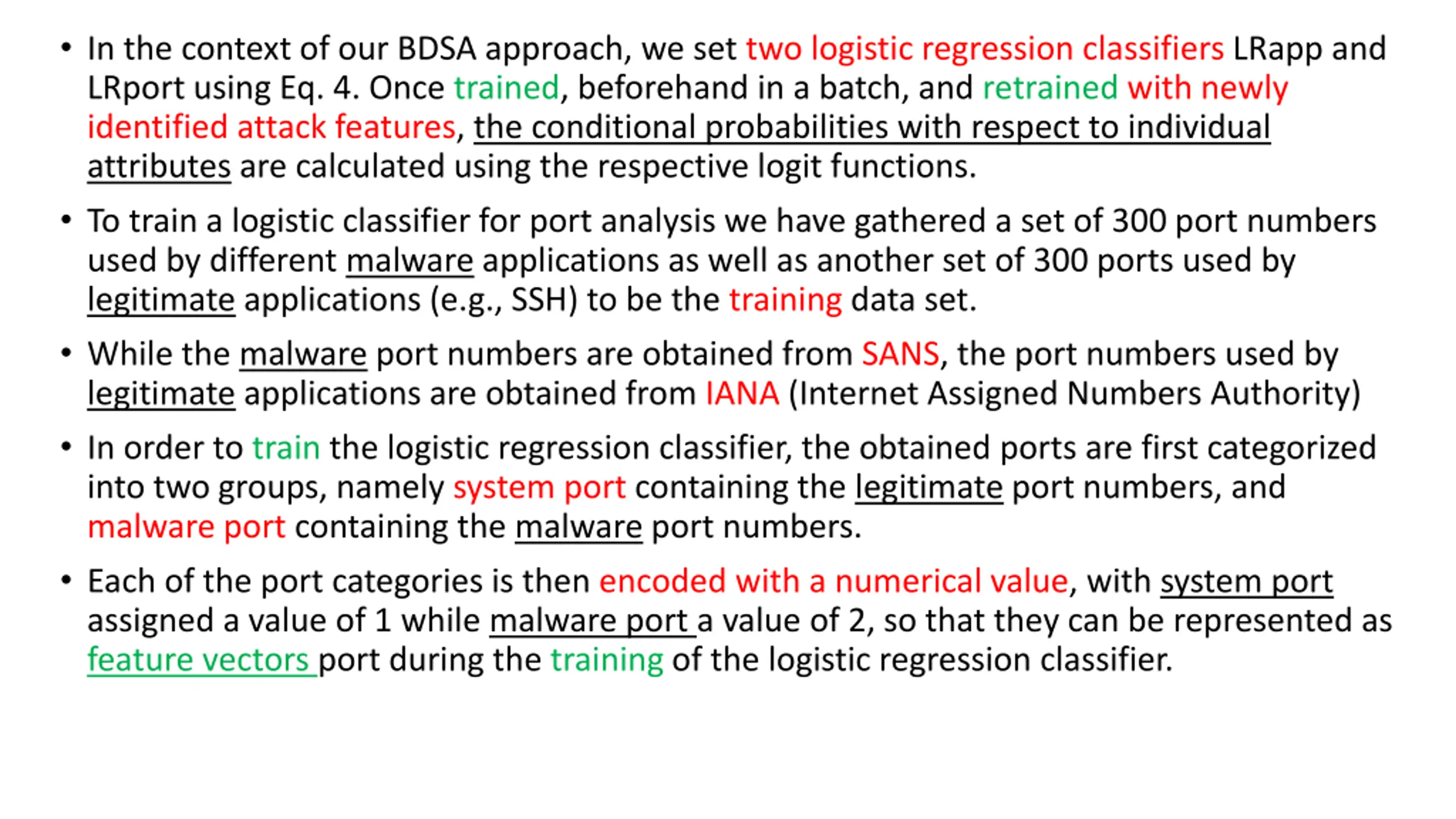 In the context of our BDSA approach, we set two logistic regression classifiers LRapp and LRport using Eq. 4. Once trained, beforehand in a batch, and retrained with newly identified attack features, the conditional probabilities with respect to individual attributes are calculated using the respective logit functions. To train a logistic classifier for port analysis we have gathered a set of 300 port numbers used by different malware applications as well as another set of 300 ports used by legitimate applications (e.g., SSH) to be the training data set. While the malware port numbers are obtained from SANS, the port numbers used by legitimate applications are obtained from IANA (Internet Assigned Numbers Authority) In order to train the logistic regression classifier, the obtained ports are first categorized into two groups, namely system port containing the legitimate port numbers, and malware port containing the malware port numbers. Each of the port categories is then encoded with a numerical value, with system port assigned a value of 1 while malware port a value of 2, so that they can be represented as feature vectors port during the training of the logistic regression classifier.
