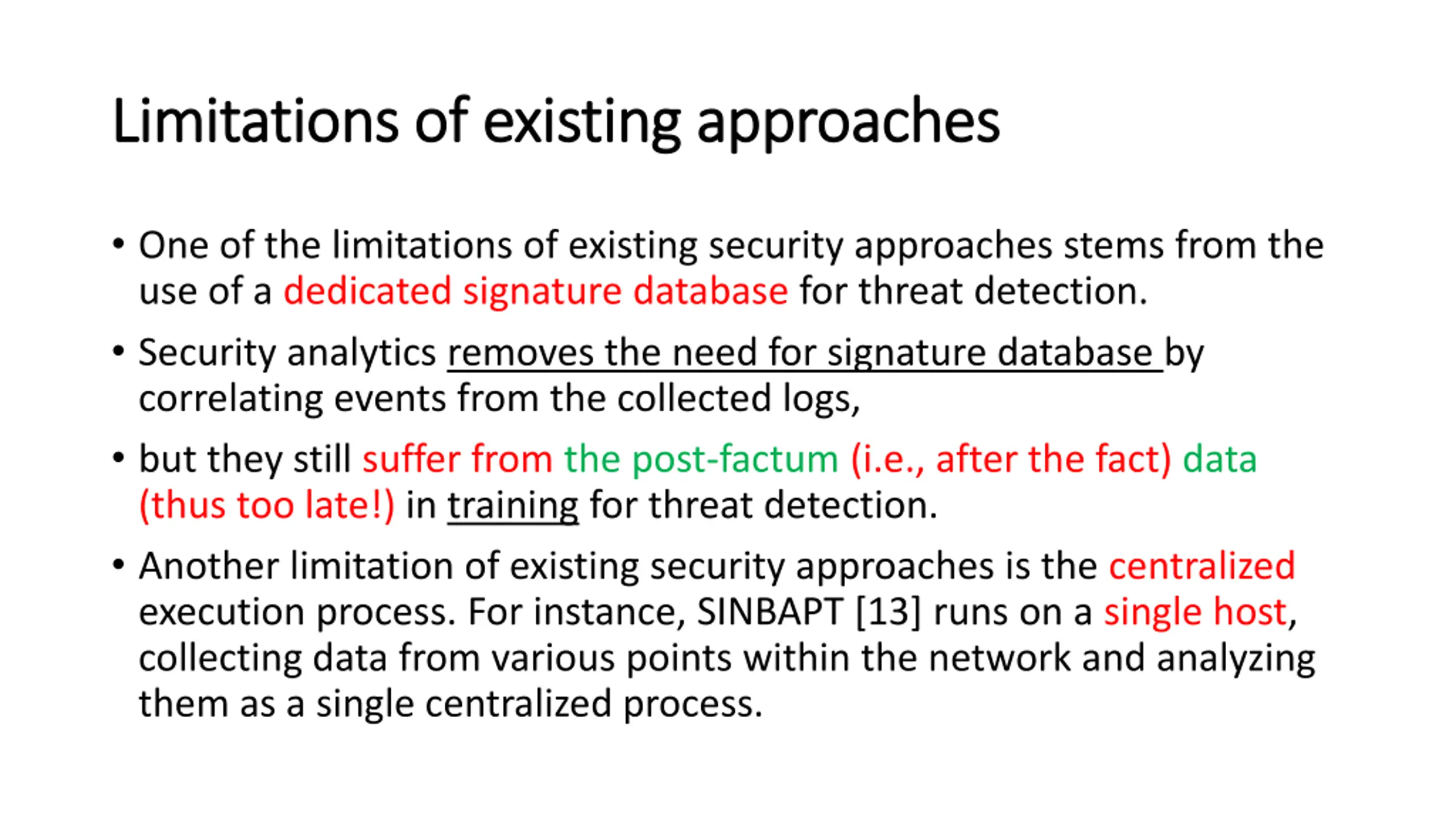 Limitations of existing approaches Limitations of existing approaches One of the limitations of existing security approaches stems from the use of a dedicated signature database for threat detection. Security analytics removes the need for signature database by correlating events from the collected logs, but they still suffer from the post-factum (i.e., after the fact) data (thus too late!) in training for threat detection. Another limitation of existing security approaches is the centralized execution process. For instance, SINBAPT [13] runs on a single host, collecting data from various points within the network and analyzing them as a single centralized process.