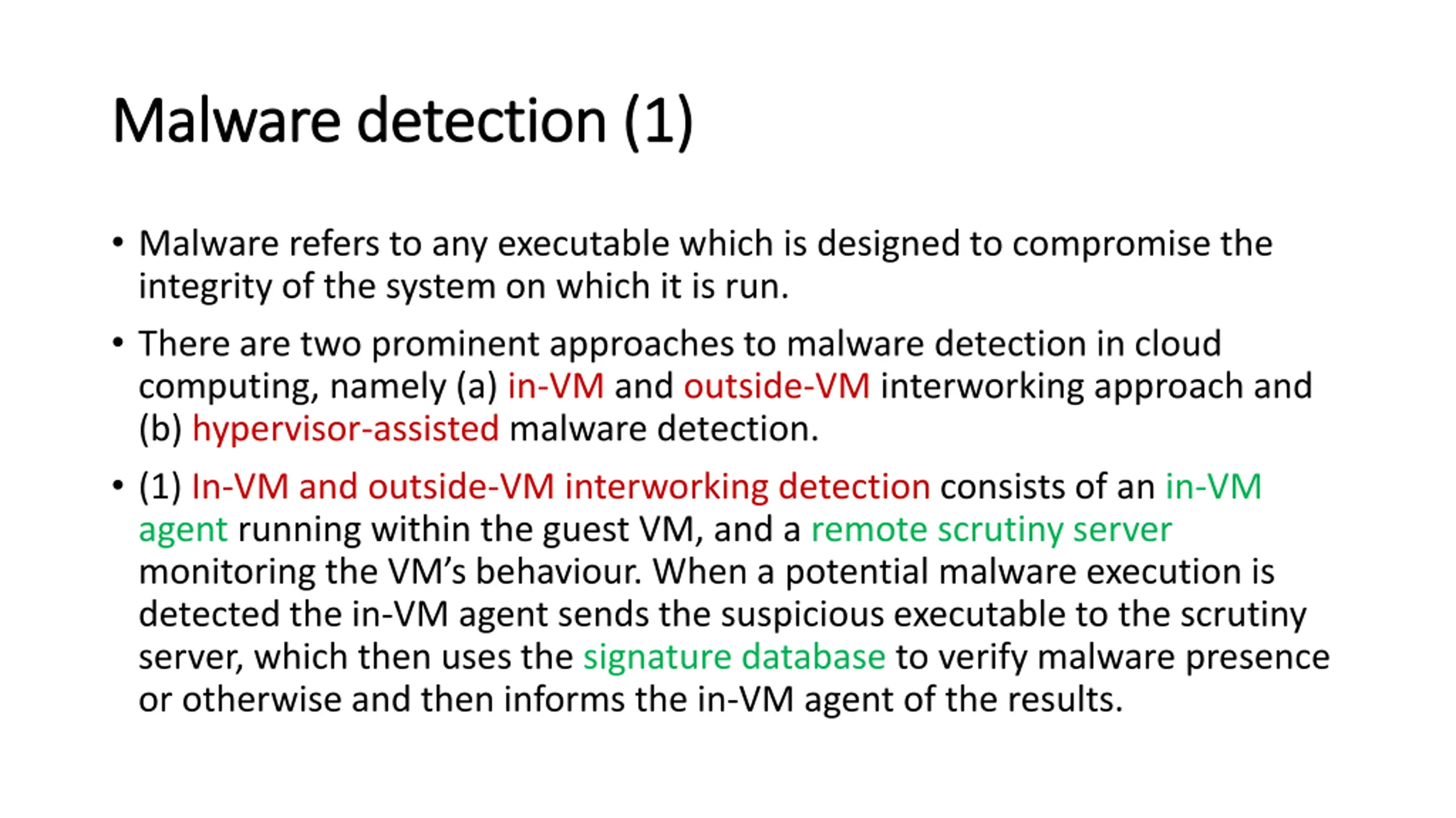 Malware detection (1) Malware detection (1) Malware refers to any executable which is designed to compromise the integrity of the system on which it is run. There are two prominent approaches to malware detection in cloud computing, namely (a) in-VM and outside-VM interworking approach and (b) hypervisor-assisted malware detection. (1) In-VM and outside-VM interworking detection consists of an in-VM agent running within the guest VM, and a remote scrutiny server monitoring the VM s behaviour. When a potential malware execution is detected the in-VM agent sends the suspicious executable to the scrutiny server, which then uses the signature database to verify malware presence or otherwise and then informs the in-VM agent of the results.