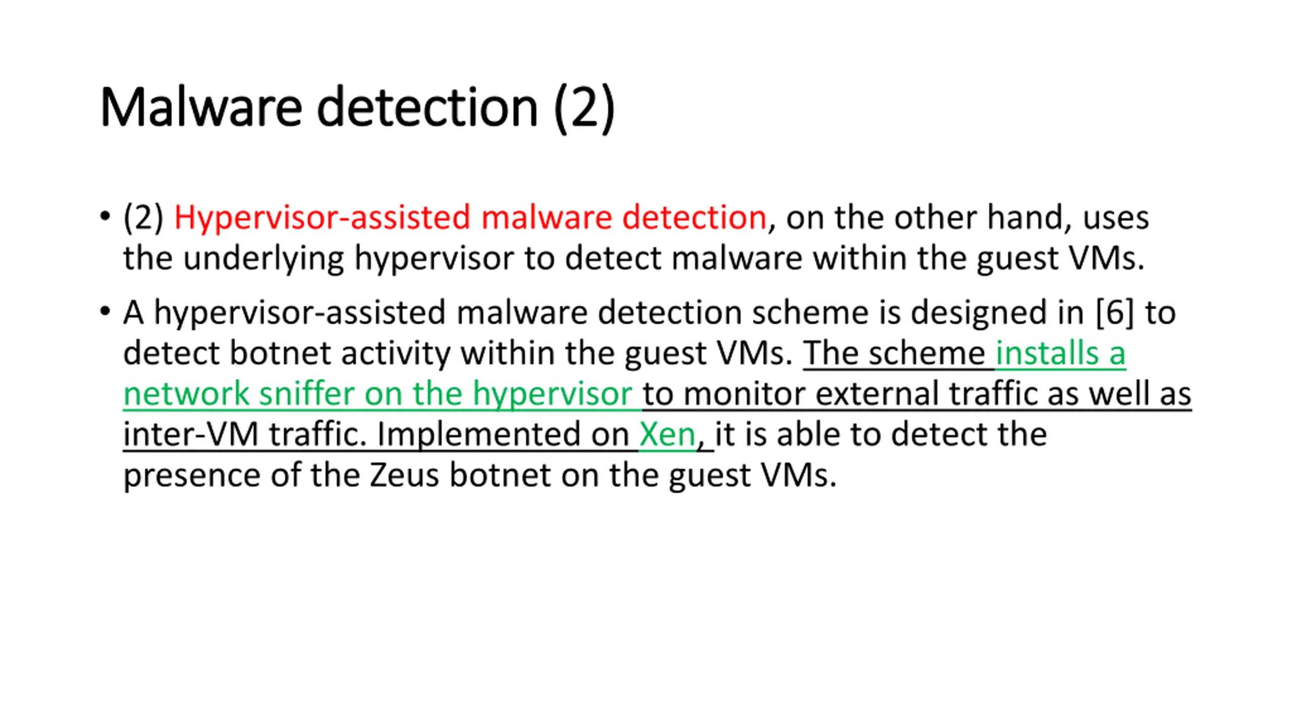 Malware detection (2) Malware detection (2) (2) Hypervisor-assisted malware detection, on the other hand, uses the underlying hypervisor to detect malware within the guest VMs. A hypervisor-assisted malware detection scheme is designed in [6] to detect botnet activity within the guest VMs. The scheme installs a network sniffer on the hypervisor to monitor external traffic as well as inter-VM traffic. Implemented on Xen, it is able to detect the presence of the Zeus botnet on the guest VMs.