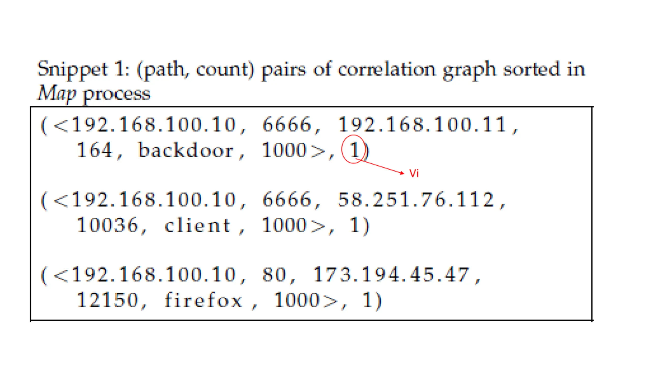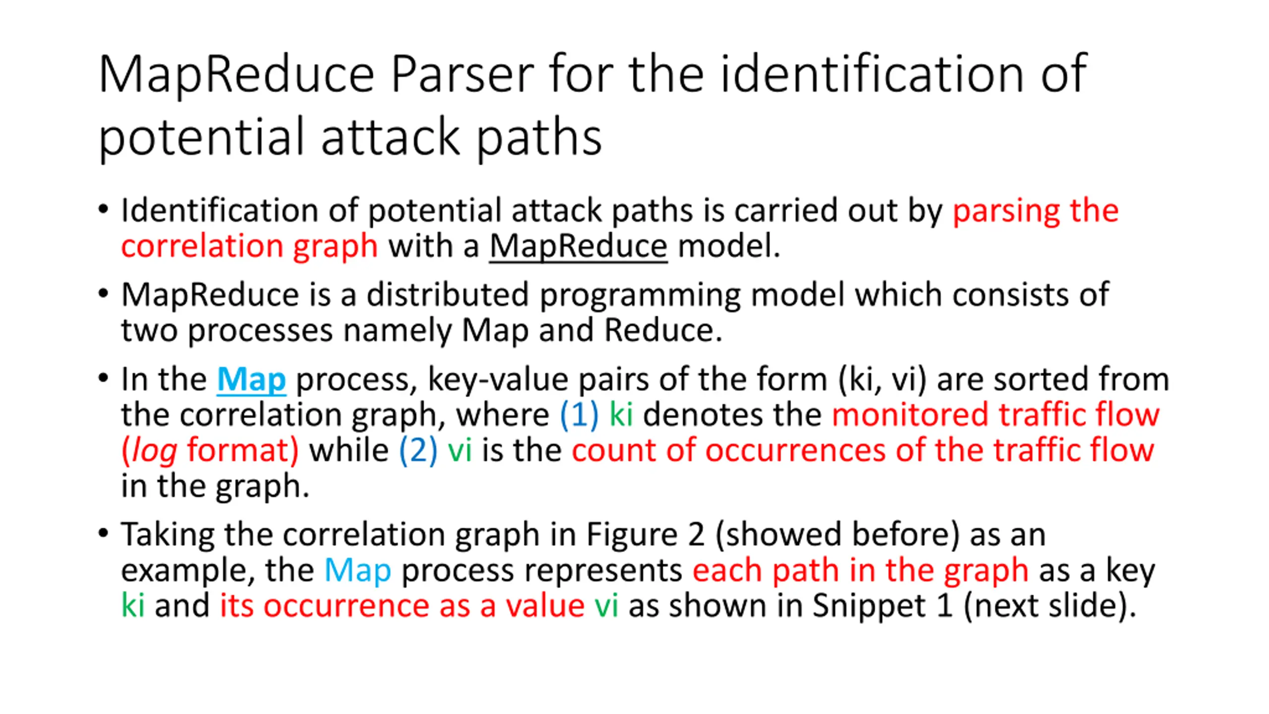 MapReduce Parser for the identification of potential attack paths Identification of potential attack paths is carried out by parsing the correlation graph with a MapReduce model. MapReduce is a distributed programming model which consists of two processes namely Map and Reduce. In the Map process, key-value pairs of the form (ki, vi) are sorted from the correlation graph, where (1) ki denotes the monitored traffic flow (log format) while (2) vi is the count of occurrences of the traffic flow in the graph. Taking the correlation graph in Figure 2 (showed before) as an example, the Map process represents each path in the graph as a key ki and its occurrence as a value vi as shown in Snippet 1 (next slide).