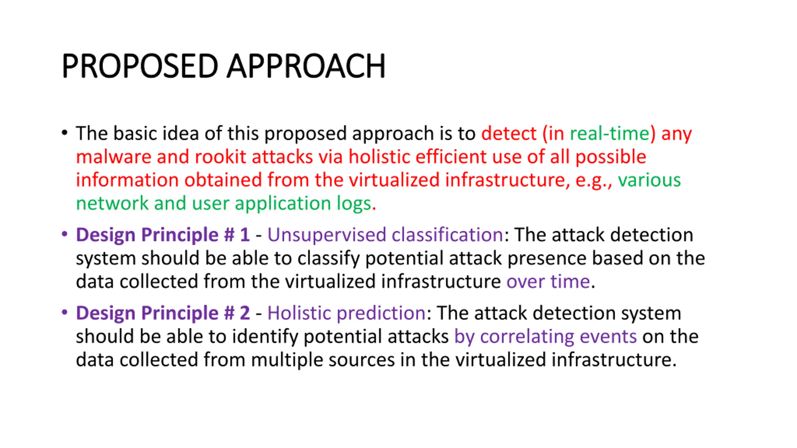 PROPOSED APPROACH PROPOSED APPROACH The basic idea of this proposed approach is to detect (in real-time) any malware and rookit attacks via holistic efficient use of all possible information obtained from the virtualized infrastructure, e.g., various network and user application logs. Design Principle # 1 - Unsupervised classification: The attack detection system should be able to classify potential attack presence based on the data collected from the virtualized infrastructure over time. Design Principle # 2 - Holistic prediction: The attack detection system should be able to identify potential attacks by correlating events on the data collected from multiple sources in the virtualized infrastructure.