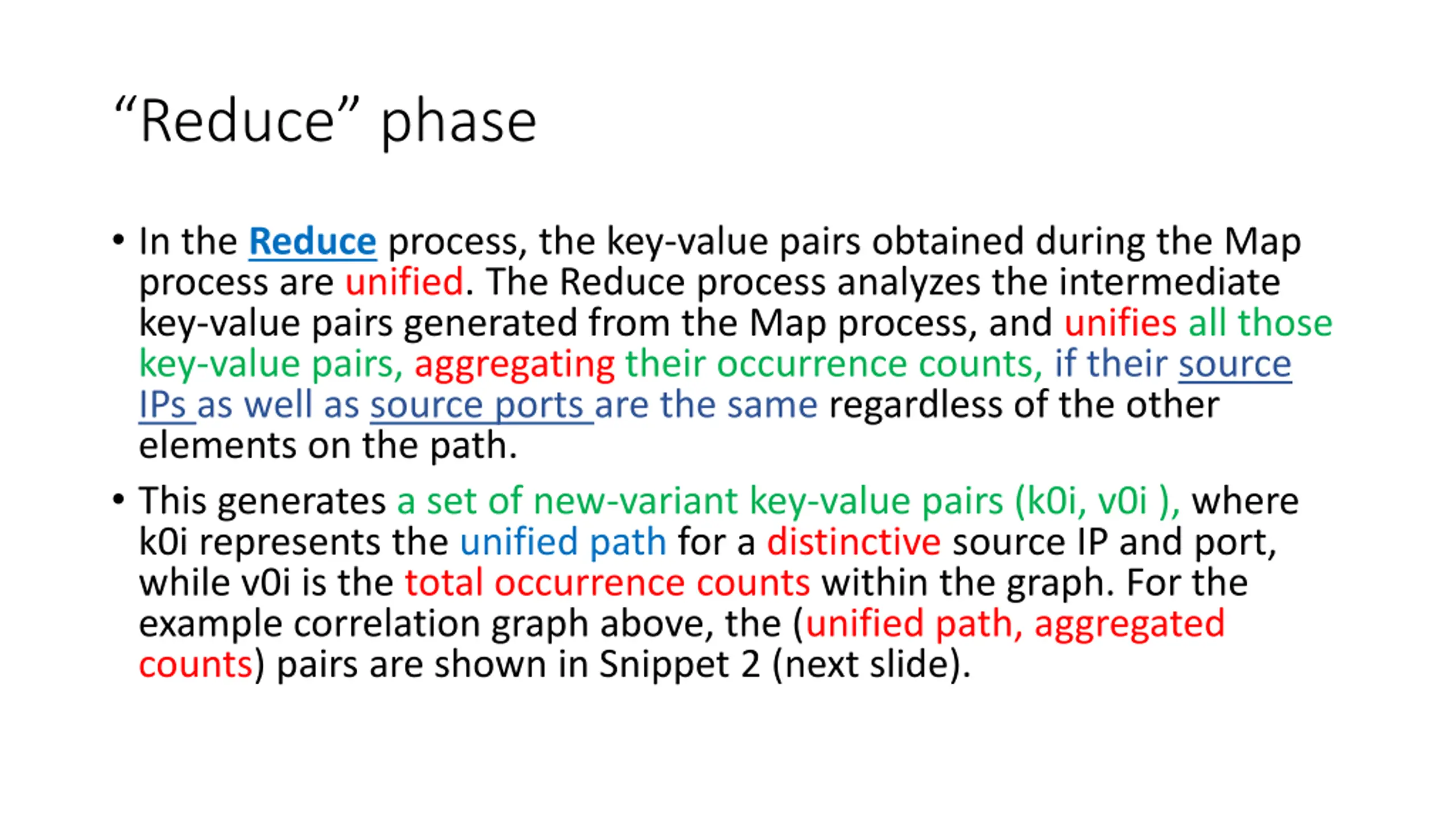Reduce phase In the Reduce process, the key-value pairs obtained during the Map process are unified. The Reduce process analyzes the intermediate key-value pairs generated from the Map process, and unifies all those key-value pairs, aggregating their occurrence counts, if their source IPs as well as source ports are the same regardless of the other elements on the path. This generates a set of new-variant key-value pairs (k0i, v0i ), where k0i represents the unified path for a distinctive source IP and port, while v0i is the total occurrence counts within the graph. For the example correlation graph above, the (unified path, aggregated counts) pairs are shown in Snippet 2 (next slide).