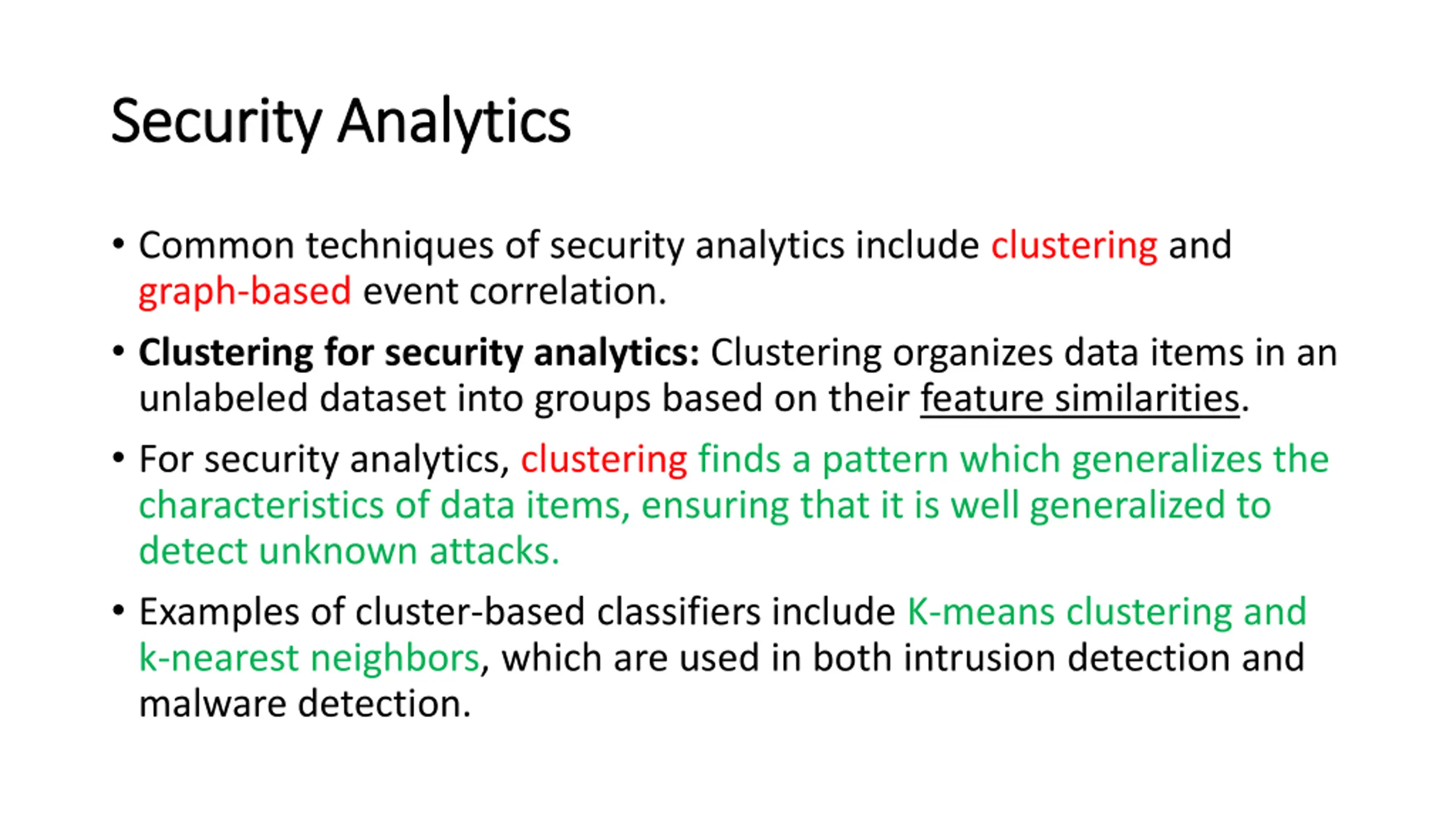Security Analytics Security Analytics Common techniques of security analytics include clustering and graph-based event correlation. Clustering for security analytics: Clustering organizes data items in an unlabeled dataset into groups based on their feature similarities. For security analytics, clustering finds a pattern which generalizes the characteristics of data items, ensuring that it is well generalized to detect unknown attacks. Examples of cluster-based classifiers include K-means clustering and k-nearest neighbors, which are used in both intrusion detection and malware detection.