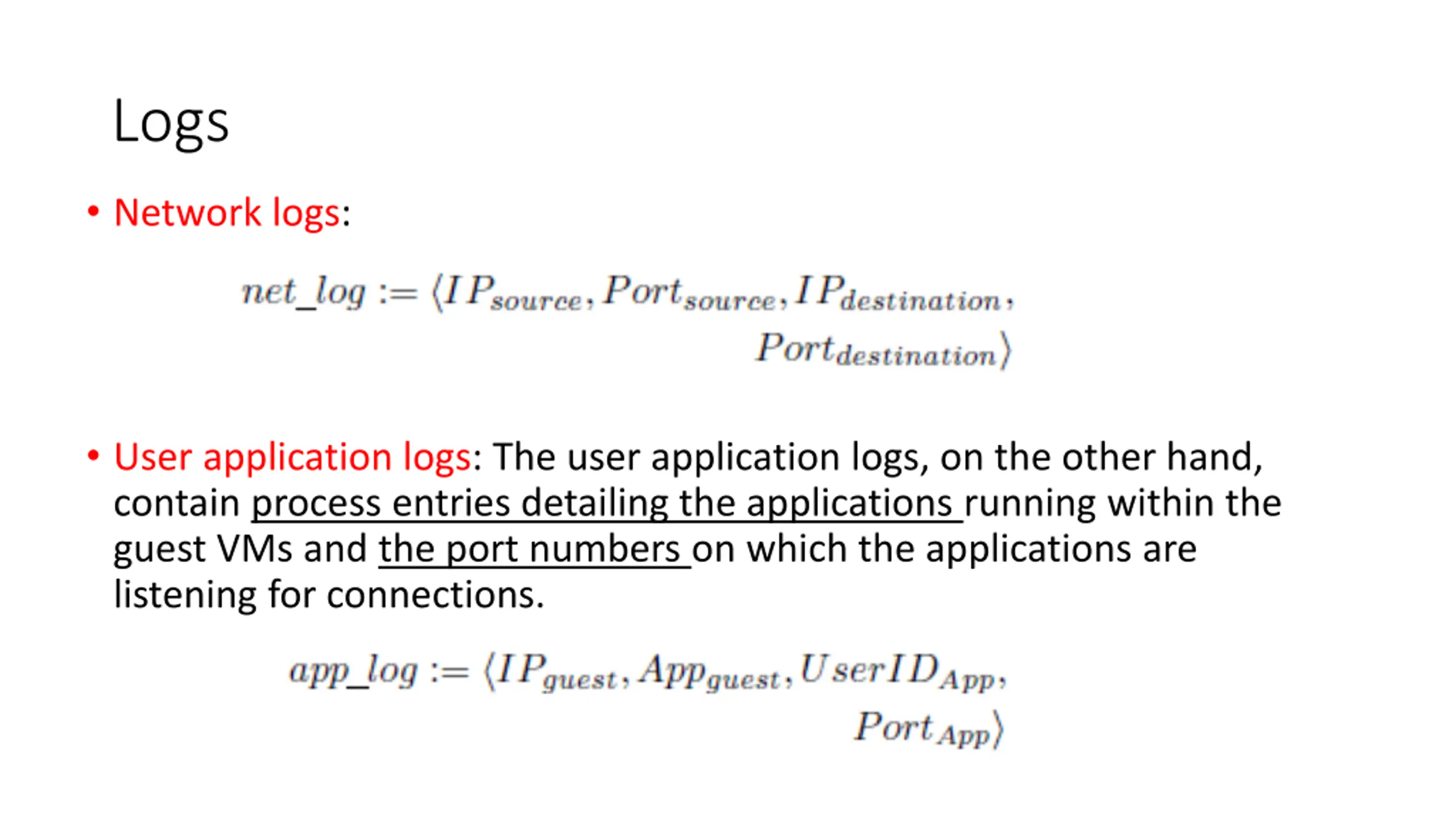 Logs Network logs: User application logs: The user application logs, on the other hand, contain process entries detailing the applications running within the guest VMs and the port numbers on which the applications are listening for connections.