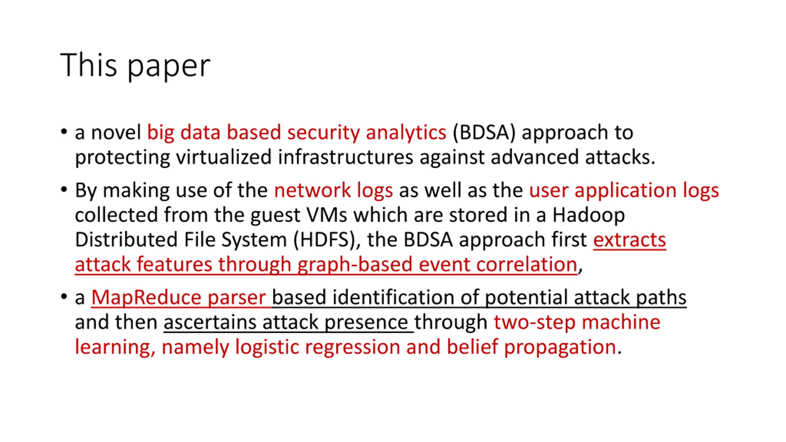 Paper abstract Virtualized infrastructure in cloud computing has become an attractive target for cyberattackers to launch advanced attacks. This paper proposes a novel big data based security analytics approach to detecting advanced attacks in virtualized infrastructures. Network logs as well as user application logs that are collected periodically from the guest virtual machines (VMs) are stored in the Hadoop Distributed File System (HDFS). Then, extraction of attack features is performed through graph-based event correlation and MapReduce parser based identification of potential attack paths. Next, determination of attack presence is performed through two-step machine learning, namely logistic regression is applied to calculate attack s conditional probabilities with respect to the attributes, and belief propagation is applied to calculate the belief in existence of an attack.