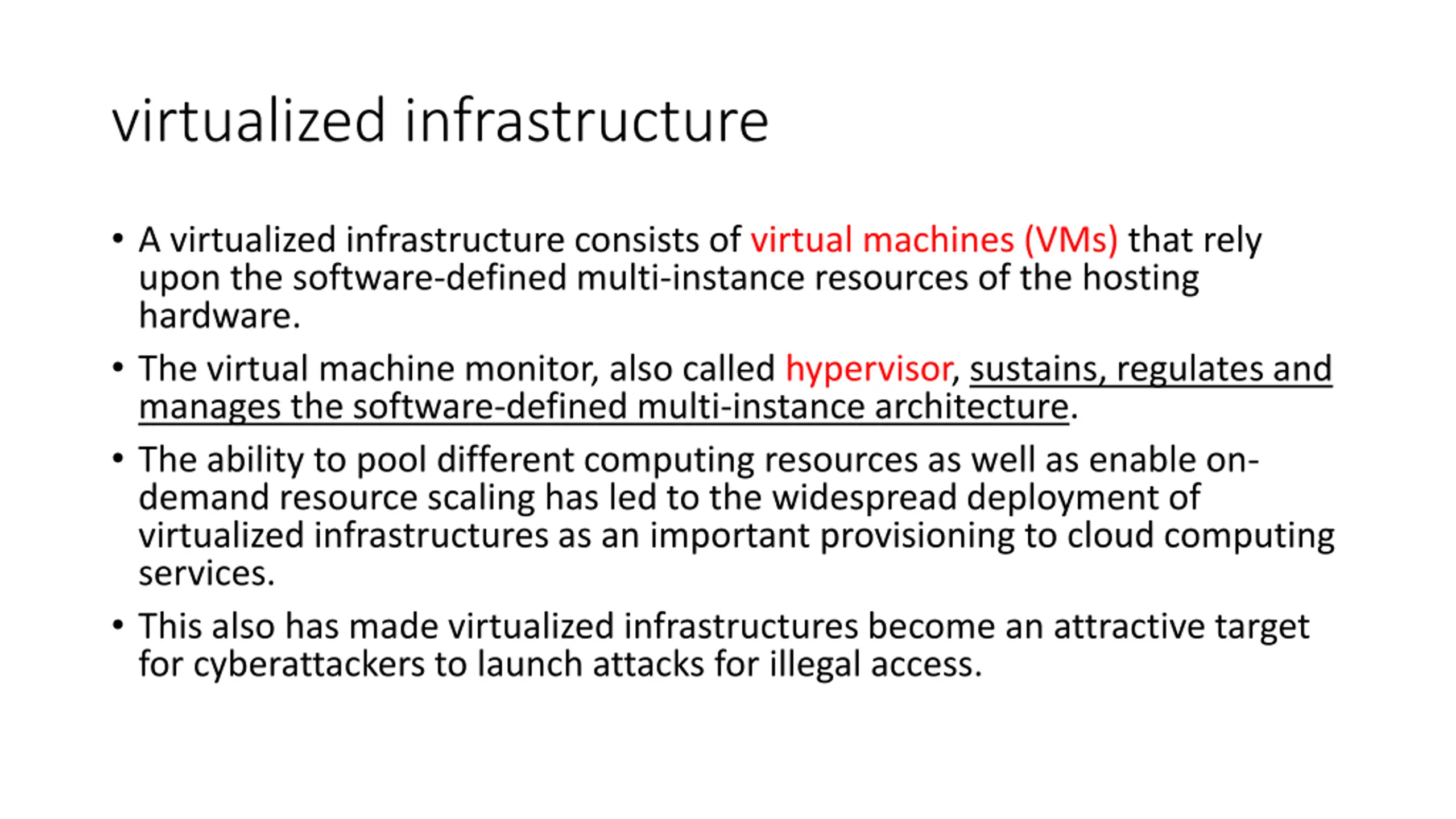 virtualized infrastructure A virtualized infrastructure consists of virtual machines (VMs) that rely upon the software-defined multi-instance resources of the hosting hardware. The virtual machine monitor, also called hypervisor, sustains, regulates and manages the software-defined multi-instance architecture. The ability to pool different computing resources as well as enable on- demand resource scaling has led to the widespread deployment of virtualized infrastructures as an important provisioning to cloud computing services. This also has made virtualized infrastructures become an attractive target for cyberattackers to launch attacks for illegal access.