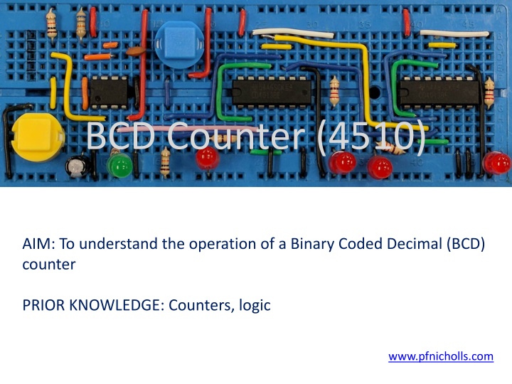 BCD Counter (4510) AIM: To understand the operation of a Binary Coded Decimal (BCD) counter PRIOR KNOWLEDGE: Counters, logic www.pfnicholls.com