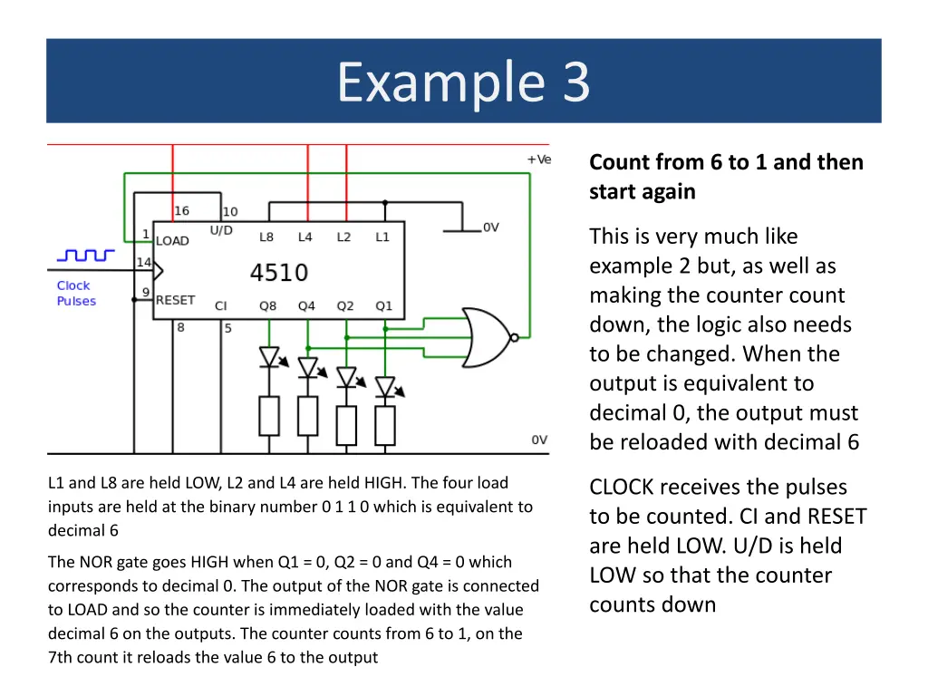 Example 3 Count from 6 to 1 and then start again This is very much like example 2 but, as well as making the counter count down, the logic also needs to be changed. When the output is equivalent to decimal 0, the output must be reloaded with decimal 6 L1 and L8 are held LOW, L2 and L4 are held HIGH. The four load inputs are held at the binary number 0 1 1 0 which is equivalent to decimal 6 CLOCK receives the pulses to be counted. CI and RESET are held LOW. U/D is held LOW so that the counter counts down The NOR gate goes HIGH when Q1 = 0, Q2 = 0 and Q4 = 0 which corresponds to decimal 0. The output of the NOR gate is connected to LOAD and so the counter is immediately loaded with the value decimal 6 on the outputs. The counter counts from 6 to 1, on the 7th count it reloads the value 6 to the output