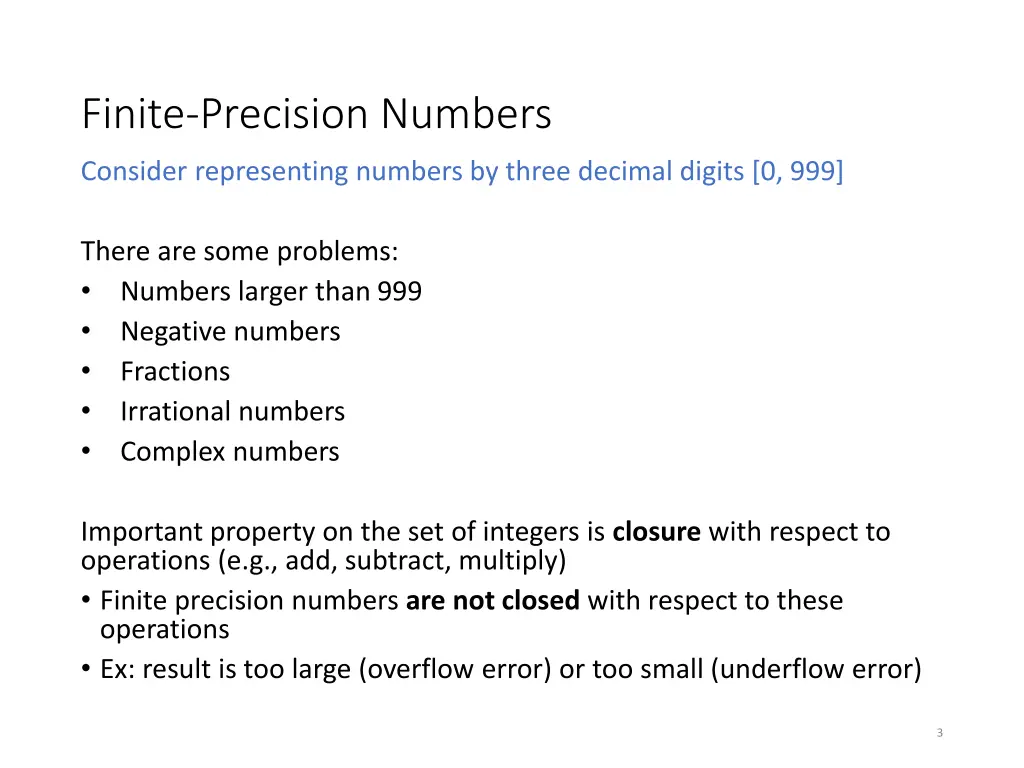 Finite-Precision Numbers Consider representing numbers by three decimal digits [0, 999] There are some problems: Numbers larger than 999 Negative numbers Fractions Irrational numbers Complex numbers Important property on the set of integers is closure with respect to operations (e.g., add, subtract, multiply) Finite precision numbers are not closed with respect to these operations Ex: result is too large (overflow error) or too small (underflow error) 3
