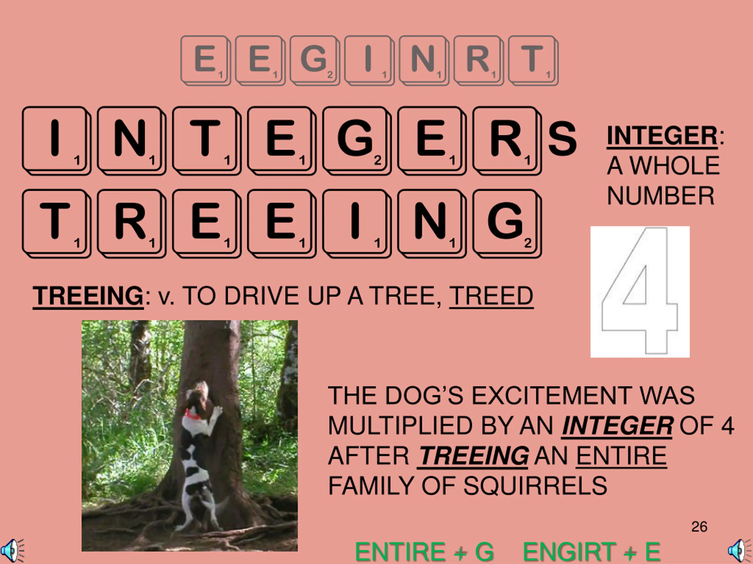 EEGINRT INTEGER TREEING S INTEGER: A WHOLE NUMBER TREEING: v. TO DRIVE UP A TREE, TREED THE DOG S EXCITEMENT WAS MULTIPLIED BY AN INTEGER OF 4 AFTER TREEING AN ENTIRE FAMILY OF SQUIRRELS 26 ENTIRE + G ENGIRT + E